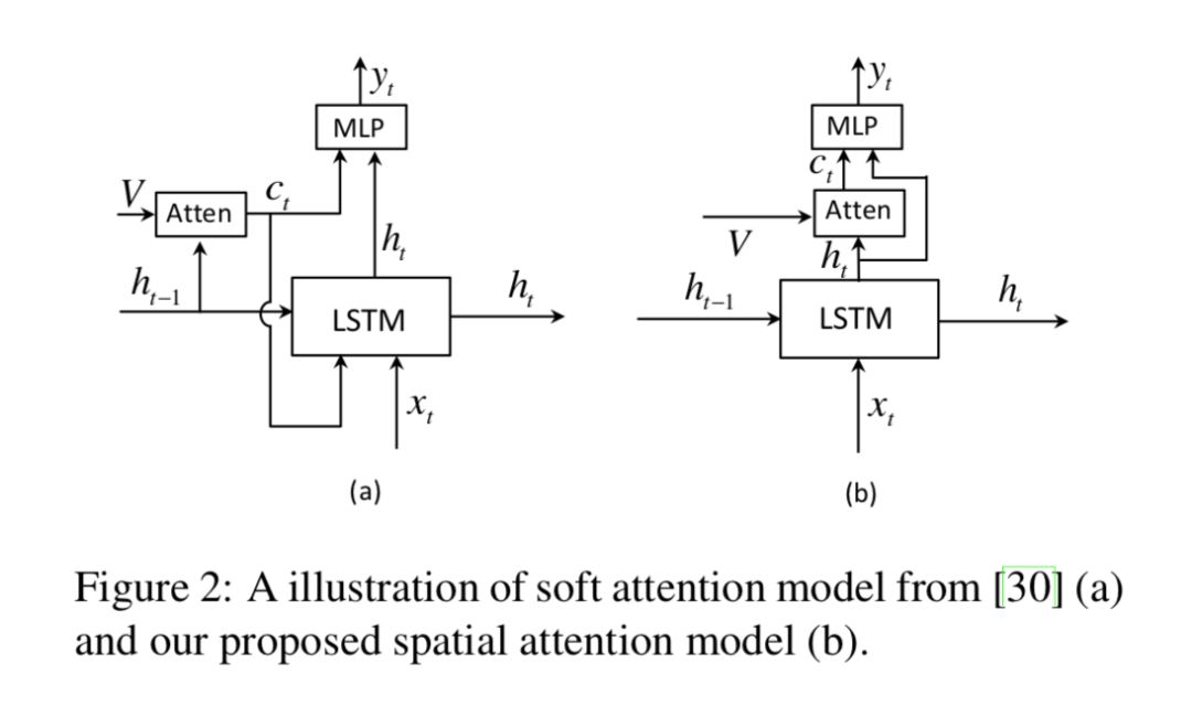 作者认为 ct 可以看作 ht 的残差连接,可以在预测下一个词时降低不确定性或者提供情报。(不是应该做一个实验验证使用 ht 和 ht−1 的差别?)并且发现,这种 Spatial Attention 方式比其他模型表现更好。