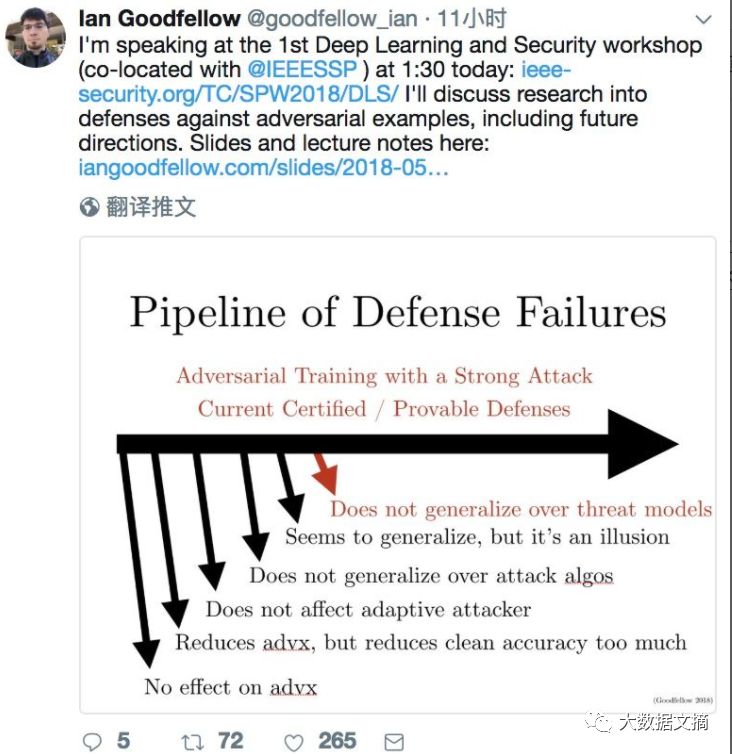 继上周密集更新的推特小课堂后,时刻操心着大家学习的Ian Goodfellow老师又发推文给大家开小灶了! 先来回顾一下上周的推特小课堂: 昨天,Ian Goodfelow在Deep Learning and Security worshop(IEEESSP)上发表演讲,主题是对抗性实例安全性研究及其未来发展的方向。秉着"大家good才是真的good"的精神,我们的goodfellow随即在推特上给大家分享了这次演讲的PDF链接: