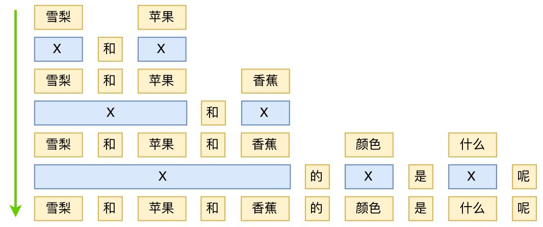 +---> (鸡蛋)可以(吃)吗 | +---> 鸡蛋 | | +---> 鸡蛋 | +---> 可以 | +---> 吃 | | +---> 吃 | +---> 吗 +---> (牛肉鸡蛋)可以(吃)吗 | +---> 牛肉鸡蛋 | | +---> 牛肉 | | +---> 鸡蛋 | +---> 可以 | +---> 吃 | | +---> 吃 | +---> 吗 +---> (苹果)的(颜色)是(什么)呢 | +---> 苹果 | | +---> 苹果 | +---> 的 | +---> 颜色 | | +---> 颜色 | +---> 是 | +---> 什么 | | +---> 什么 | +---> 呢 +---> (雪梨和苹果和香蕉)的(颜色)是(什么)呢 | +---> (雪梨和苹果)和(香蕉) | | +---> (雪梨)和(苹果) | | | +---> 雪梨 | | | | +---> 雪梨 | | | +---> 和 | | | +---> 苹果 | | | | +---> 苹果 | | +---> 和 | | +---> 香蕉 | | | +---> 香蕉 | +---> 的 | +---> 颜色 | | +---> 颜色 | +---> 是 | +---> 什么 | | +---> 什么 | +---> 呢