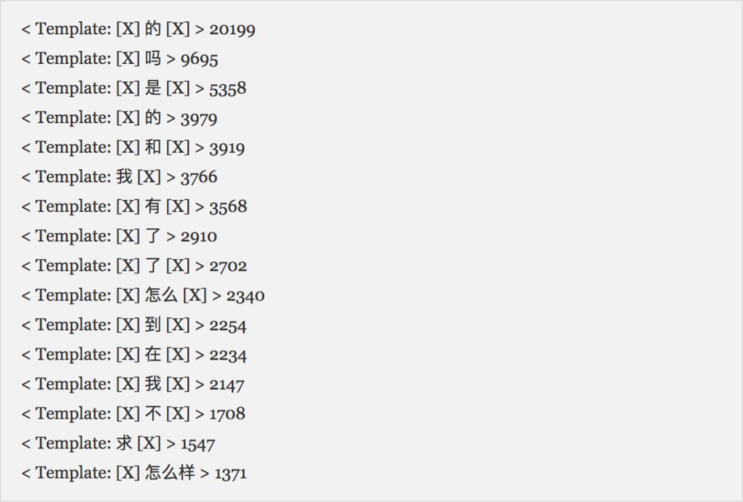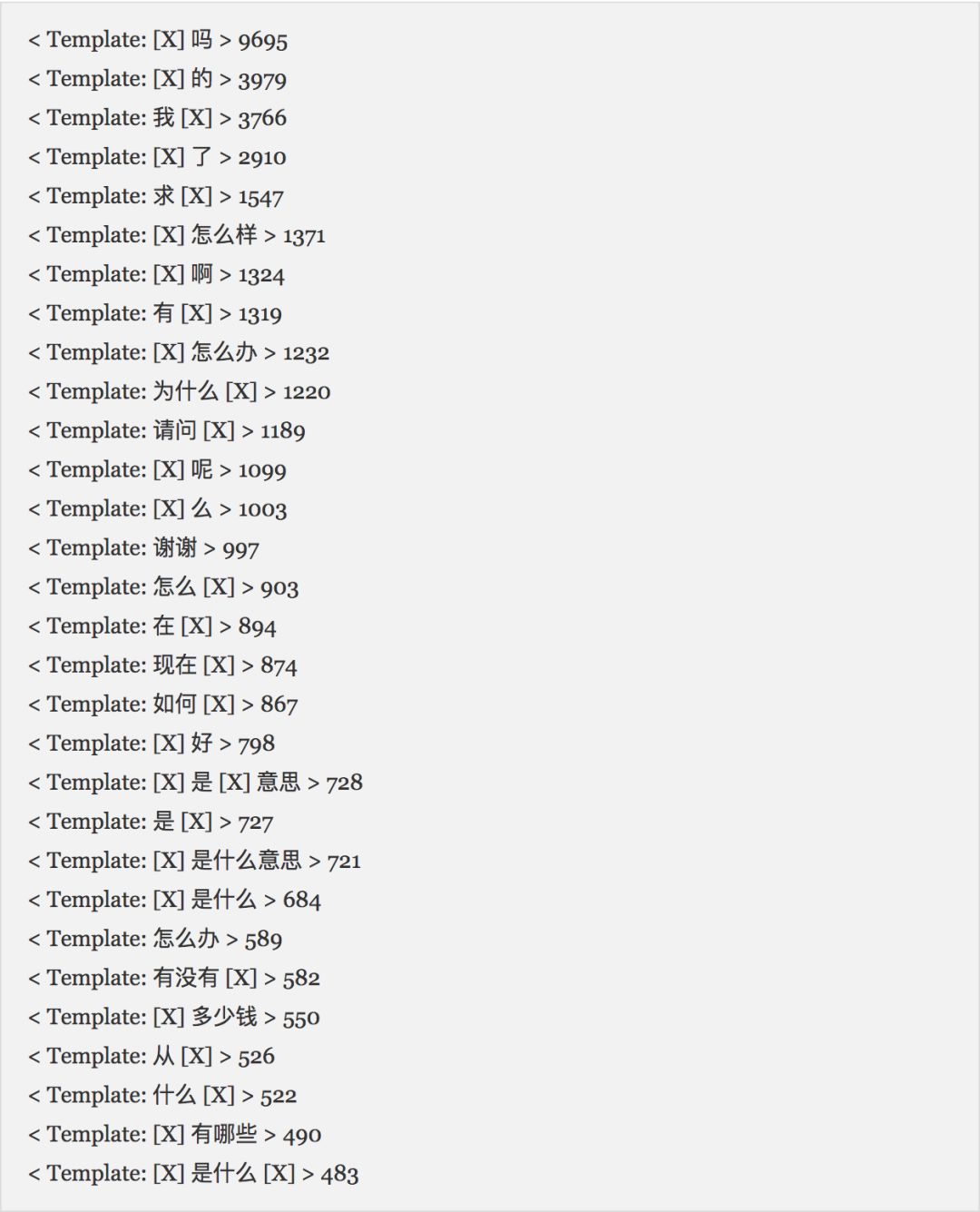 下面是从百度知道的问题集中抽取出来的一些句模版(数字是统计出来的频数,可以忽略):