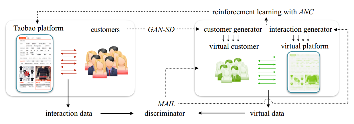 在这个项目中,淘宝研究人员通过买家的历史购买记录,生成了"虚拟淘宝(Virtual Taobao)";平台,虚拟的买家可进入淘宝触发平台搜索引擎。