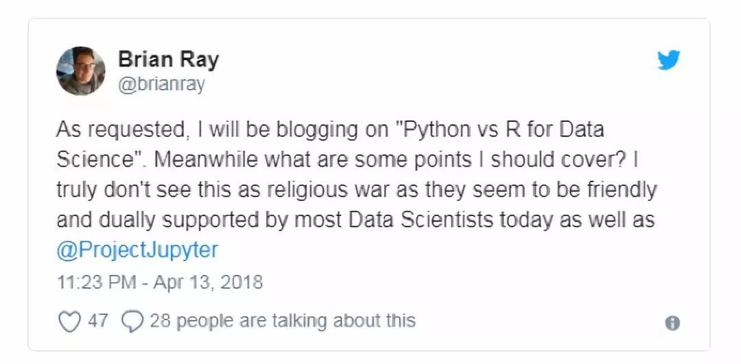 Hadley Wickham,RStudio的首席数据科学家,已经给出了回答:与其说选择其中一种语言(R"还是"Python)更好,还不如说让两种语言相互合作 (R"和"Python)是最佳的选择。所以,我所说的第三种选项就是同时使用Python和R。这让我很感兴趣,我也将在本文末尾处详细阐述。 Hadley Wickham推特: https://twitter.com/hadleywickham 以下不是两种语言的详细对比清单,只是一些值得进行对比的要素: 历史:R和Python有着差异明显又相互交错的历史。 使用群体:实地调查显示了许多复杂的社会学和人类学因素。 性能:详细的性能比较,以及为什么很难比较两种语言的原因。 第三方支持:模块、代码库、可视化工具、组织及开发环境。 用例:某些类型的工作或任务中,更适用于使用两种语言中的一种。 同时使用两种语言:在Python中使用R,在R中使用Python。 R与Python预测能力的比较:介绍一个"自给自足"的练习。 企业和个人偏好:揭晓最终答案