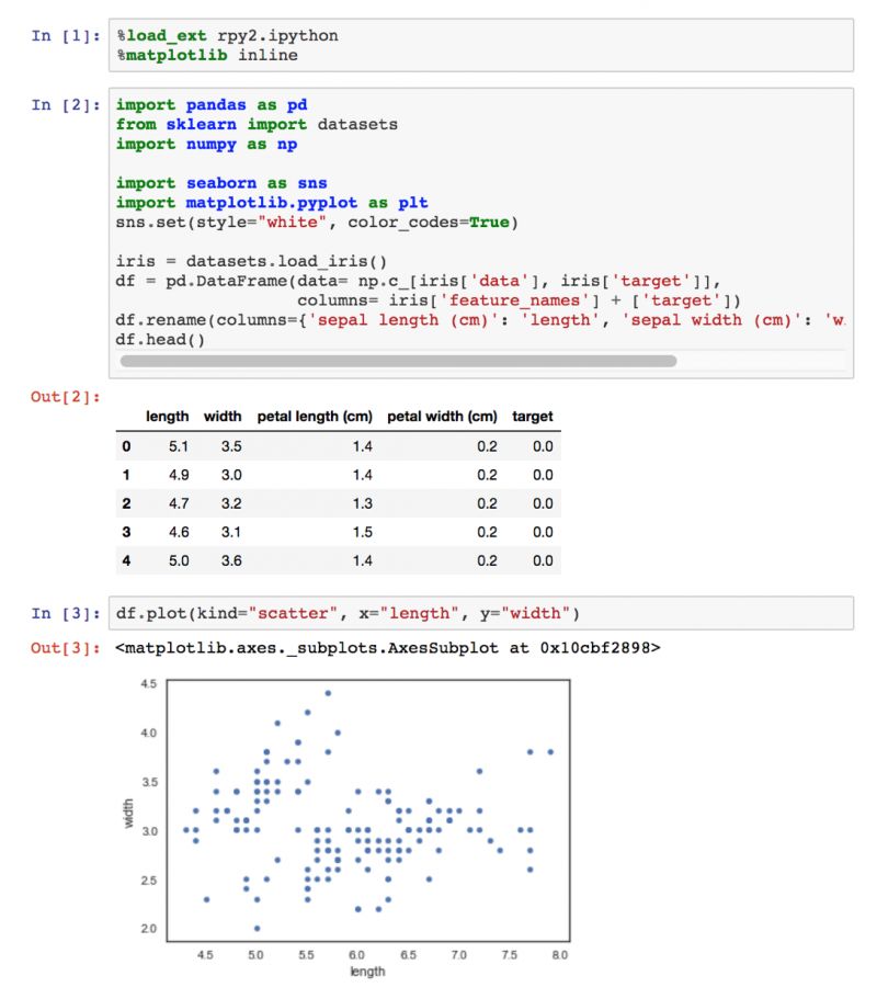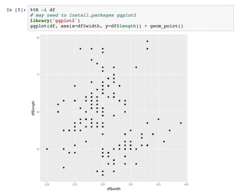 然后我们就可以直接传递Pandas的DataFrames,rpy2会自动将其转换为R的DataFrames,并通过"-i df"进行切换。