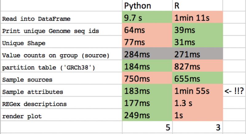 运行结果:36.9 µs ± 5.99 µs per loop (mean ± std. dev. of 7 runs, 1000 loops each) 在程序的合理性检验中,加载时间以及在命令行上的总运行时间:R语言是0m0.238s,Python是0m0.147s。再次强调,这并不是一个严谨的科学测试。 但这个简单的测试表明,Python的速度明显更快。虽然在大多数情况下,这并不是十分重要。 一种语言的速度快慢对于一个数据科学家而言的意义在哪里呢?这两种语言的兴起是因为它们可以被当作"命令语言"来使用。例如,我们使用Python工作时,对Pandas语言包的依赖性很大。这就引出了两种语言模块和库上更深层次的比较,事实上,这也是一个更具意义的比较。 Python拥有PyPI,而R使用CRAN,并且它们都可以使用Anaconda。 CRAN使用其内置的"install.packages"命令进行使用。截止撰写本文时止,CRAN上大约有1.2万个包可以使用。其中有超过二分之一(大约6千多个)甚至更多的包跟数据科学相关。 PyPi拥有10倍于R的包数量,14.1万个包。其中有3700个包被标记为用于特定的科学工程领域。还有很多包虽然没被标记但的确也用于科学应用。 在这两种语言中,似乎都没有太多完全重复的包。当我在PyPi中搜索"Random Forest"时,我们得到了170个项目,但是都不尽相同。 尽管Python的软件包数量是R的10倍,但数据科学相关的软件包的数量大致相同。 第三方工具包的可用性是非常重要的。为了用指定的开发语言而不得不从头开始写程序很令人沮丧。但与此同时,如果你确实需要这样做,我希望你能将你的成果贡献给开源社区。 DataFrames与Pandas的比较可能更有意义。 我们进行了一项实验,在同一环境下比较它们针对复杂分析任务时,每一个步骤的执行时间,结果如下。