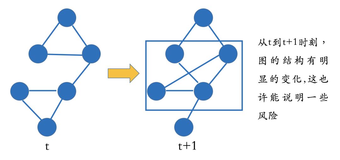 在下面的图中,我们给出了一个知识图谱T时刻和T+1时刻的结构,我们很容易看出在这两个时刻中间,图谱结构(或者部分结构)发生了很明显的变化,这其实暗示着潜在的风险。那怎么去判断这些结构上的变化呢? 感兴趣的读者可以查阅跟"dynamic network mining"相关的文献。