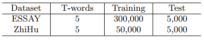 在生成策略上为了保证文本的多样性,我们采用beam-search+sample的策略,beam为10,从中随机选取一个作为文本生成结果。 3. 实验 3.1 语料构建 在本文中,我们的研究内容是作文自动生成,更具体的,是生成更多符合多主题的作文文本,为此我们建立一个作文语料库(ESSAY)。写作是中国高考语文卷中的一道大题,因此在互联网上有很多优秀作文样例供广大考生学习。所以,我们打算直接收集这些数据作为训练语料,同时为了保证爬取的文本质量,我们只对那些有评语和评分的作文进行爬取。具体过程如下,1)我们首先爬取了228,110 篇作文,并且这些都是老师评分比较高的;2)由于我们针对的是段落级文本生成任务,所以从这些作文中筛选出词数目在50-100的段落,组成我们的语料数据集;3)我们和诗歌生成一样,用textrank从这些段落中抽取出关键词作为话题词集。具体的语料集数量如表1所示。此外,由于作文语料库是由textrank抽取算法得到的话题词,其结果必然存在一些噪声。为了解决这一问题,我们又爬取了知乎语料库(ZhiHu),在这个数据集中,每个问题文本都有用户给出的1到5个话题词,和作文语料库类似,我们爬取那些词数目在50-100并且有五个话题词的段落,构建语料库,具体数量如表1所示。 表1 数据集信息(T代表主题词的数量)