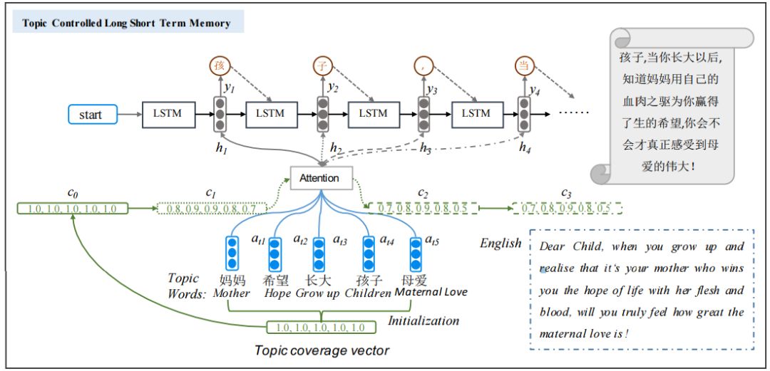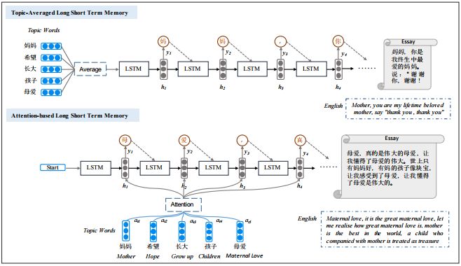 | 本文介绍哈尔滨工业大学社会计算与信息检索研究中心(SCIR)录用于IJCAI 2018的论文《Topic-to-Essay Generation with Neural Networks》,在本文中,我们提出了段落级作文生成任务,其输入为固定个数的话题词,输出是一段关于这些话题词的作文描述;在方法层面,我们采用Seq2Seq的神经网络框架,针对多主题输入情况,我们加入主题感知的coverage方法,使得作文能够在表达不同主题语义的情况下,着重针对某一主题进行表述。我们自动构建了两个作文相关语料库,并通过客观和主观评价说明我们的模型结果均优于基线方法。本论文的实验代码和数据已经开源:https://ift.tt/2sv5JDg 论文作者:冯骁骋、刘家豪、秦兵、刘挺 关键词:文本生成,神经网络,作文生成 联系邮箱:xcfeng@ir.hit.edu.cn 个人主页:http://ir.hit.edu.cn/ xcfeng/ 1. 引言 随着近几年来人工智能的飞速发展,我们想要去验证一下机器是否真的能够像人一样能说会道,其中作文自动生成可以看作是一个极具代表性的任务,不仅需要计算机去理解题意还要计算机针对所理解内容生成较长篇幅的作文,这其中逻辑通顺、语义连贯、主题明确、表达清晰都是所要研究的难点,针对这一问题,我们定义了段落级作文生成任务,其输入是多个话题词,输出是围绕这些话题词的一些文本,可以看作是段落级的作文。图1给出了具体示意,其输入的话题词是"妈妈","孩子","希望","长大"和"母爱"。