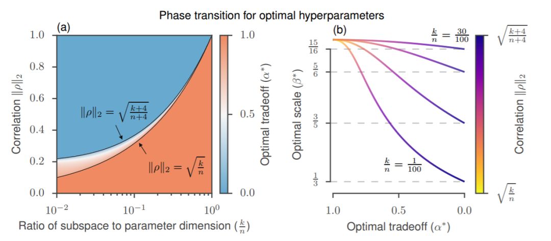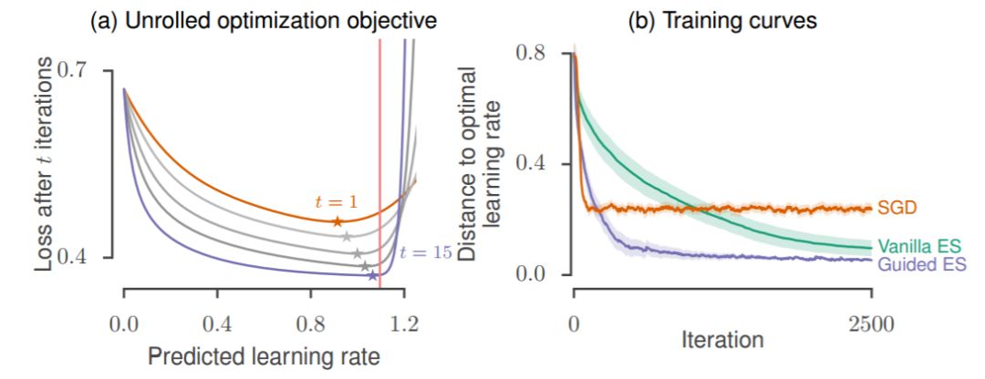 图 3:选择最优超参数。(a)阴影区域显示了在 平面中最优超参数的不同机制。细节请参阅 3.4 节。(b)随着 增加,最优超参数从 α^ ∗ = 1, β^∗ = n /(n+2) 到α^∗ = 0, β^∗ = k /(k+2) 划出了一条曲线。 图 4:展开优化。(a)少量展开优化步骤(t)展开优化过程中的损失情况的偏置。(b)用于训练多层感知器的训练曲线(显示为与最优点的距离),它作为一个用于优化的函数的特征值的函数去预测最佳学习率。细节请参阅 4.2 节。