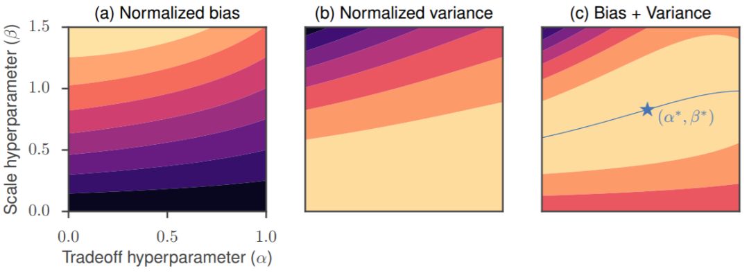 图 2:在带引导的进化策略中对偏置-方差权衡进行探索。归一化偏置˜b 的等高线图(a),归一化方差 v˜的等高线图(b),以及前面二者之和的等高线图(c)。它们是关于权衡(α)和规模(β)超参数的函数,其中, 是固定的。在这些等高线图中,子空间维数被设定为 k=3,参数维数被设定为 n=100。(c)中蓝色的线表示对于每一个 α 值来说最优的 β,星标表示全局最优点。