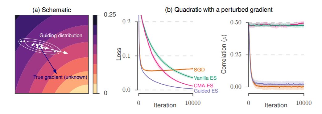 | 1 引言 机器学习模型的优化常常涉及最小化代价函数,其中代价关于模型参数的梯度是已知的。当梯度信息可用时,梯度下降和变量等一阶方法因其易于实现、存储效率高(通常需要与参数维度相匹配的存储空间)和收敛有保障 [1] 而广受欢迎。然而,当梯度信息不可用时,我们转向零阶优化方法,包括随机搜索方法,例如最近重新流行起来的进化策略 [2,3,4]。 然而,如果只有部分梯度信息可用,我们又该怎么做呢?也就是说,如果我们能够获得与真实梯度相关的代理梯度,但是这种替代方法会以某种未知的方式产生偏置,我们该怎么做?事实上,各种各样的机器学习问题中都会出现这种情况。例如,Wu 等人 在论文 [5] 中说明,在展开优化(通过一种展开优化过程计算梯度)问题中,与在许多展开步骤之后计算(代价高昂的)梯度相比,计算小规模展开步骤的梯度是存在偏置的。在其它应用中,真实梯度并不提供学习信号,我们可以用代理梯度作为一种替代。例如,在神经网络的量化问题中,我们希望用离散(甚至二值化的)权重和/或激活函数来训练神经网络。实现这个目标的一种方法是使用直流评估器 [6](STE),它通过平滑处理(或直接忽略)神经网络中一些执行量化的节点来生成代理梯度,并且使用该梯度来训练网络。然而,我们并不能保证这个方向是一个好的梯度下降方向。最后,代理梯度也出现在强化学习算法中,例如,actor-critic 方法 [7],和 Q-learning [8,9,10]。 图 1:(a)带引导的进化策略示意图。我们使用沿着给定子空间(白色箭头)延伸的分布(白色等高线)进行随机搜索,而不是使用真正的梯度方向(蓝色箭头)。(b)对不同算法的二次损失进行比较,向梯度显式地加入一个偏置,用来模拟真实梯度未知的情况。优化过程中显示了损失(左图)以及代理梯度和真实梯度(右图)之间的相关性。实验细节请参阅 4.1 节。