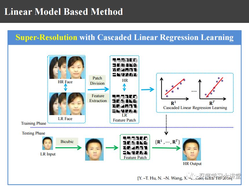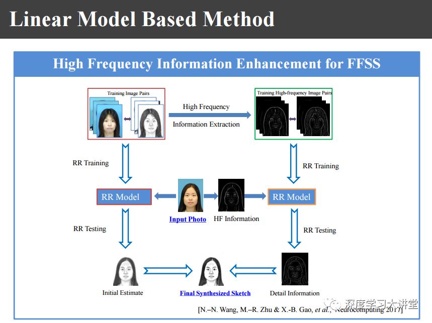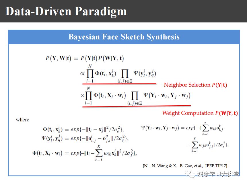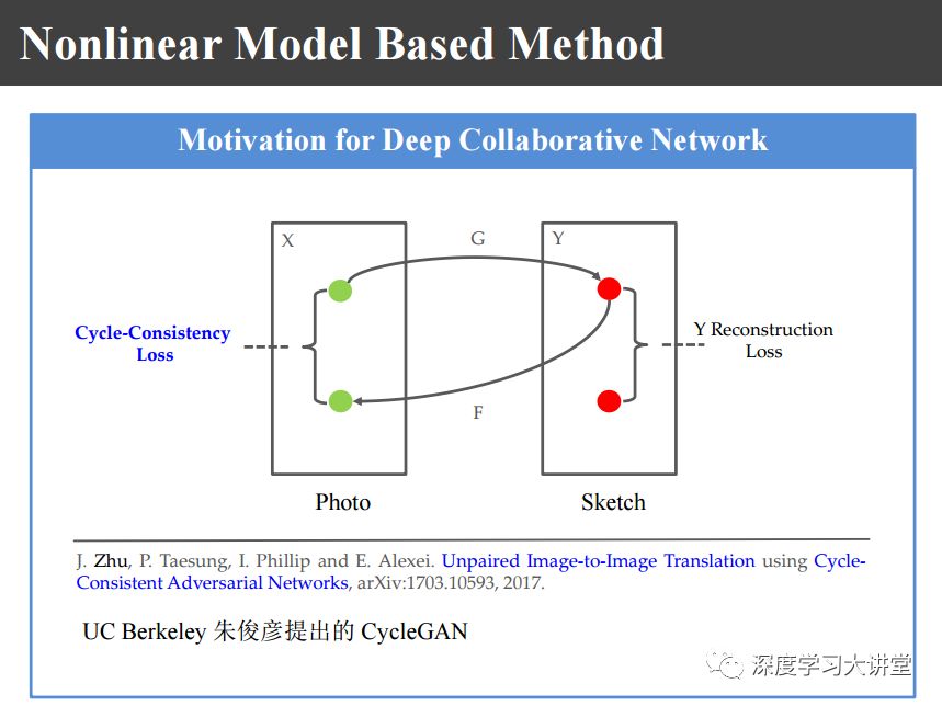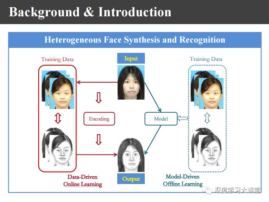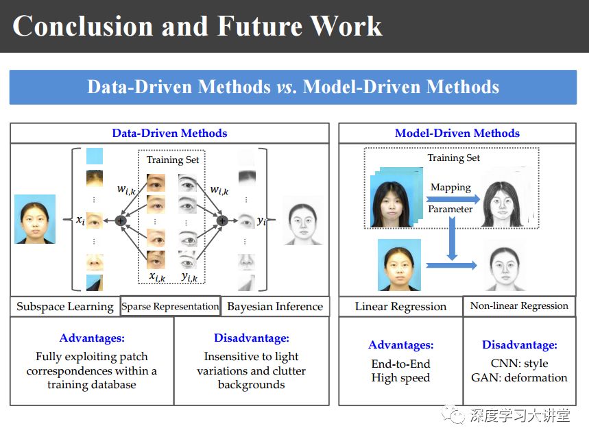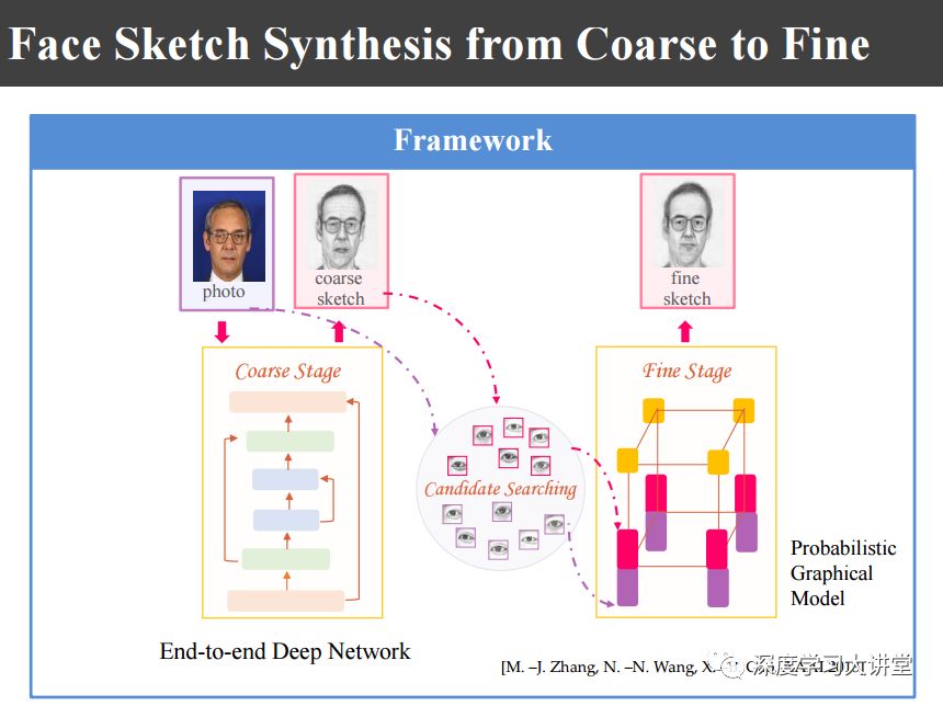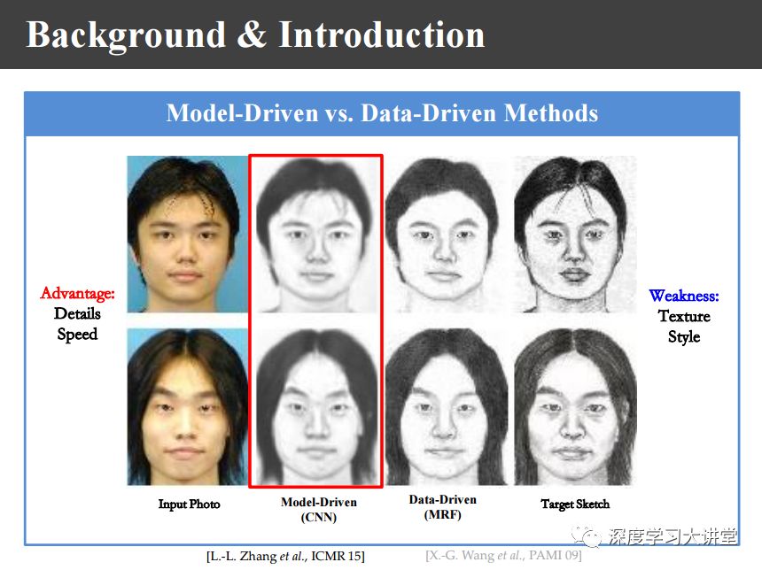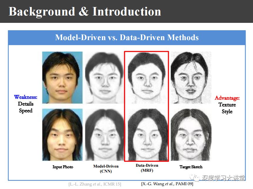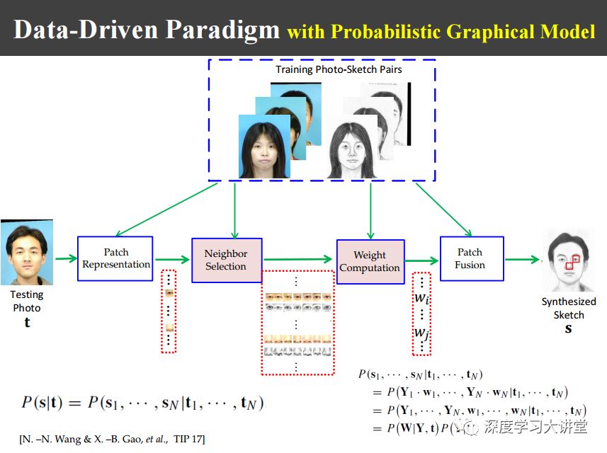 我们首先来简要看一下data-driven的相关内容。 上图是汤晓鸥教授最早在ICCV2003上发表的一个名为Eigen-Sketch的工作。利用Eigenface的思想,对照片利用训练样本进行线性组合生成,得到照片线性组合的系数以后,将组合系数叠加到画像上,可以合成出画像。这是最早的异质图像合成的工作,也是奠基性的工作。 上图是刘青山教授在CVPR2005上提出的改进工作。受启发于当时如火如荼的流形学习,他认为把整幅图像进行合成的做法存在不足,他利用LLE的思想把照片分割成一个个照片块或者画像块,再对每一块进行线性组合,组合以后把对应画像利用对应的系数合成照片,这样就把整幅图像的线性转变成局部线性嵌入。 在上述工作中仍然存在两个问题。一是选择K近邻来线性组合,K值是固定的,有的时候K个近邻块的距离是比较近的,有的时候却是比较远的,如此线性组合以后会出现模糊。这个时候正是稀疏表示发展起来的时候,我们基于稀疏表示做了相应的改进工作。 另一方面,由于线性叠加相当于低通滤波,为了使它更清晰我们又加了高通增强,对高频成分也进行线性组合以后叠加上。利用稀疏表示来自适应选择K值,K是动态变化的。另外把高频分量也进行类似学习,合成以后得到比较清晰的画像。具体算法这里不再赘述,我们在相应数据库上做了很多实验。 上图是香港中文大学做的数据库,这个数据库共有606张照片。 我们利用照片可以生成相应的画像,上图是我们生成的画像,中间一行只是利用稀疏表示生成的画像,显然不够清晰。 同样给一个画像可以反过来生成照片的例子,上图我们生成的照片。 相似的技术还可以用在其他方面,比如说我们在公安部数据库看照片的时候,都是打着网纹的,这是一种数据保护。通过我们的技术可以实现去网纹的工作,上图展示了我们的效果。 另外,同样的技术还可以利用非正面的、侧面的照片合成正面照片。 实际上,基于data-driven的方法也还存在其它问题。比如,上图所示的训练数据库里面没有出现的情况我们很难合成出来。比如说背景不一样,或者训练数据库里面都是年轻人,香港中文大学的数据库中的照片都是年轻人的,如果合成老年人,它的皱纹很难合成出来;如果数据库里面没有戴眼镜的,要想合成戴眼镜很难,因为我们眼睛的合成区域总是找相应的眼睛区域来合成的。这样就使得合成出的画像与待测试样本之间有差别,为此我们利用稀疏表示和贪婪学习的方法设计新的方法,就是进行全局搜索。 原先我们的合成是基于local mean的,这个新的学习算法实际上是一个nonlocal mean。nonlocal mean存在一个问题,如果我们要搜索一个眼睛的话,需要在整幅图上搜索它的近邻区域,这样的整幅图像搜索速度非常慢,为此我的团队提出了上图所示的基于稀疏表示的贪婪学习方法。利用训练样本我们可以构造一个字典,把每一个图像块利用字典来表示,得到基于字典的表示系数,形成一个稀疏系数矩阵,这样来一个测试图像以后,同样的也可以用字典来表示成一个系数序列。进行匹配的时候就像一个哈希搜索一样就变得非常快,这样一来就解决了快速全局搜索的问题。 上图是我们和其他方法合成效果的对比图。对于第一行戴发卡的女孩,其他方法生成出来很难有发卡,我们的方法可以很好地把发卡合成出来。同样戴眼镜的照片也是,以前的方法本身合成不出来眼镜,因为训练样本里面没有人戴眼镜,但是通过全局学习,眼镜可能就是利用他的下巴合的轮廓成出来,这样一来可以合成训练样本中没有的细节信息。 前面的学习都是基于大量训练样本的,如果我们有一个应用只有一对训练样本怎么办?也就是说我们的训练只有上图所示的一个照片和画像对,它也是可以工作的。因为可以利用人脸的多尺度构造更多的图像,一个大人通过缩放可以变成小孩;另外一个图像里面有自相似结构,比如左脸和右脸非常相似。 利用上述性质,一方面可以利用高斯金字塔生成多尺度图像,构造更多的图像和画像对。 这样如果只有一个训练对的话,利用高斯金字塔可以生成一系列不同尺度的照片和图像对。可以通过合成字典,同样利用刚才讲的贪婪学习方法合成出初始的画像。然后把训练样本和测试样本生成的初始画像这两对放在里面进行迭代,依然可以生成高质量的合成画像。 上图展示了采用不同的方法由照片合成的画像的效果,虽然只有一个照片-画像训练对,但是所合成的画像质量还是不错的。 我们进一步来把约束条件进行松弛。如果只有一个画像,连照片也没有,这就变成风格的合成,这样一来我们仍然可以合成出需要的画像。 首先利用贪婪学习算法生成初始的画像,然后利用照片和画像,分别使画像和画像匹配去寻找K近邻,基于照片和照片匹配去寻找K近邻,基于照片和画像匹配去寻找K近邻,由于画像和照片它的高频分量比较吻合,利用它做先验知识来选择一个最佳的K近邻然后进行合成,最终进行迭代以后仍然可以得到好的结果。 上图是我们利用给定风格的画像(一张),可以将给定的测试照片合成出对应风格的画像分。 同样地,对于非人脸图像的其他图像来说,也可以生成如给定的人脸图像风格一样的画像来。上图中分别展示了根据动漫风格、简单素描、复杂素描风格进行合成的画像。 当然我们还可以合成不同年龄的人脸。如果小孩走丢的时候是7、8岁,现在已