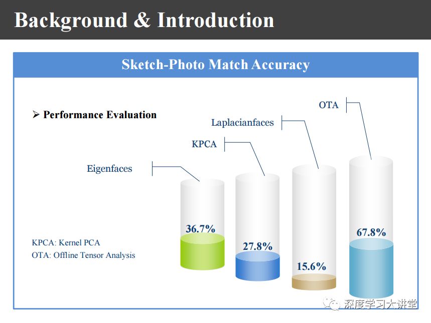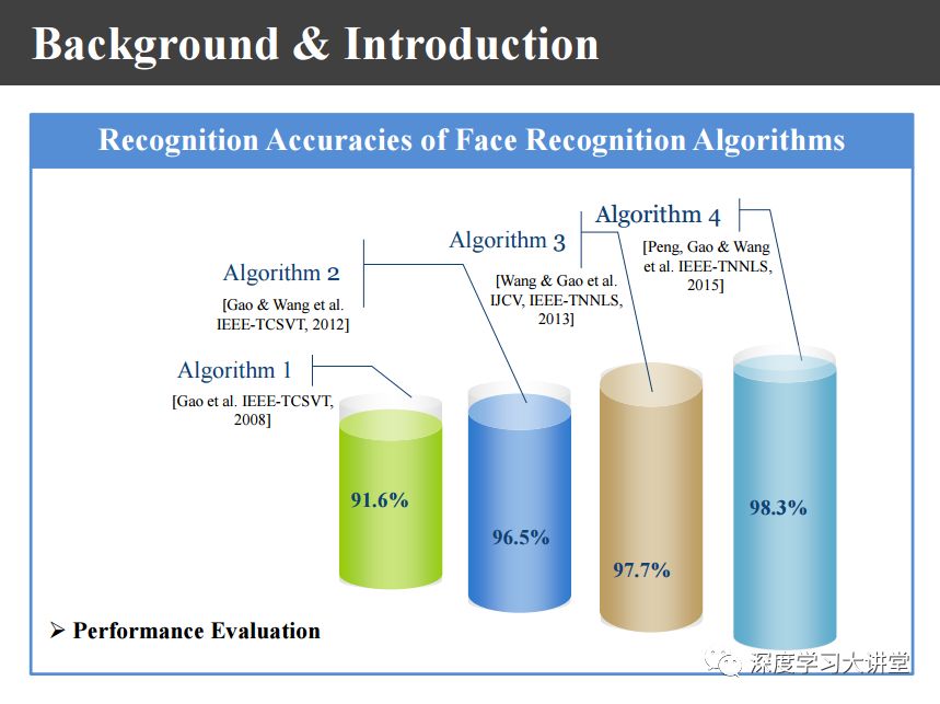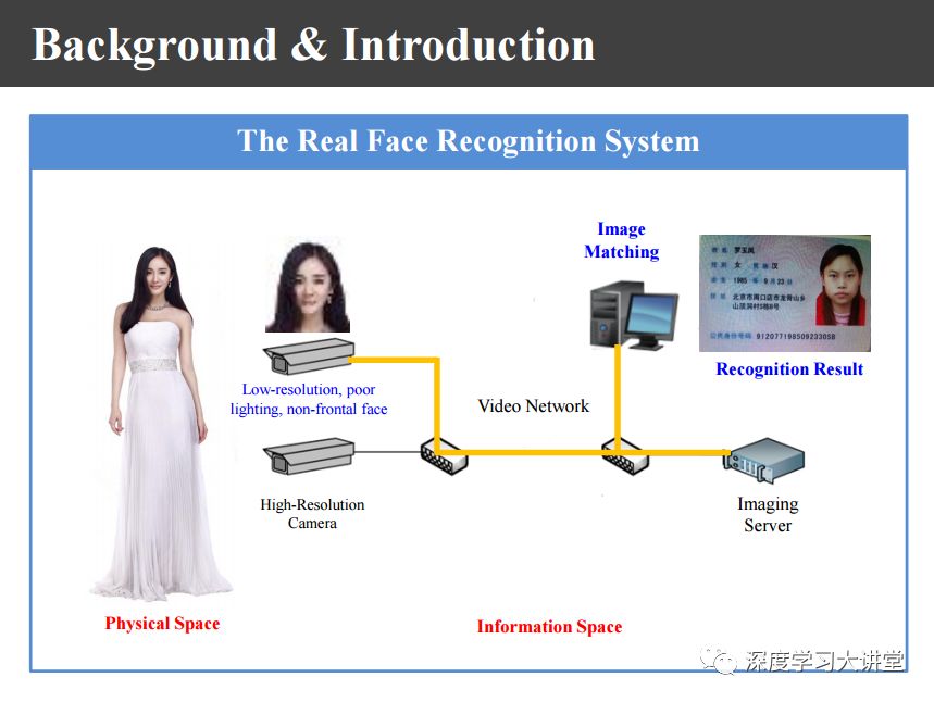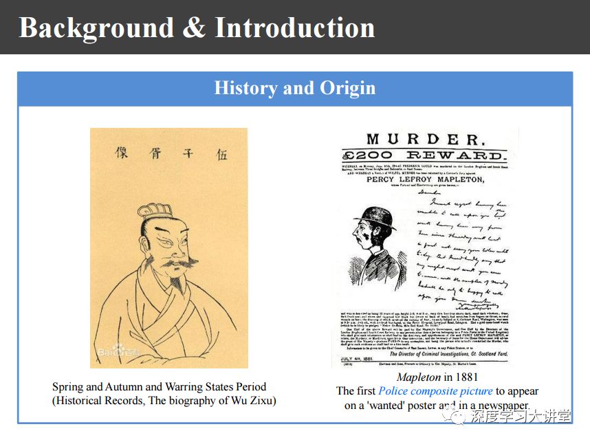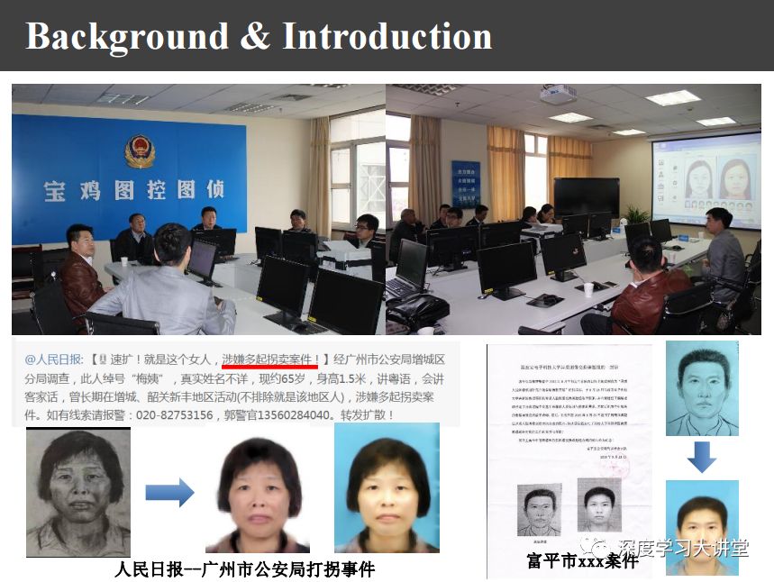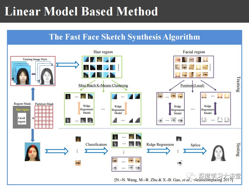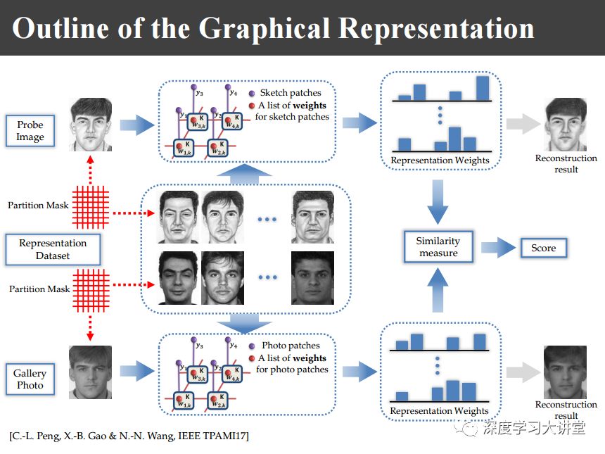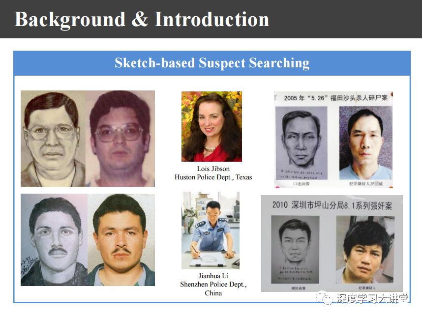 | 编者按:在机器视觉普及之前,传统模式识别系统都是基于高质量的输入图像的,要求待识别对象与图像采集设备之间很好的配合,只有这样才能获得较好的识别效果。随着图像采集设备的普及,获得目标图像的代价越来越小,由此而造成所采集到的图像质量参差不齐。在一些敏感的场合,还会出现拟识别对象与采集设备之间的不配合,造成无法获得对象的正面清晰图像,使得传统模式识别系统难以奏效。而通过引入人类智慧,利用画家经验,可以根据低质量的图像或图像序列,来生成素描画像,基于机器学习方法可以学习画像与图像之间的复杂映射关系,从而由画像合成出可用来进行模式识别的图像信息,进而取得良好的识别结果,我们可以称之为异质图像识别,或模式识别2.0。 本文中,来自西安电子科技大学的高新波教授将为大家介绍,如何通过数据驱动和模型驱动两类方法,实现异质图像的合成与识别。 文末,提供文中提到参考文献的下载链接。 我陪伴VALSE度过了七年之痒,今年就坚持到八年抗战了。今天可能是我最后一次在VALSE上做学术交流,所以我希望能系统总结一下我们团队这八年以来在异质图像合成和识别方面的工作。 首先,我们来看一下异质图像合成与识别的背景。对于模式识别任务来说,理想的识别系统经过比对以后可以很容易地识别出这个人的身份。上图是理想的人脸识别系统。 实际系统是当人站在摄像机前面时,摄像机可能是低分辨的,也可能人是不配合的,因而得到的图像质量是非常差的。在《今日说法》节目中发生案件时我们得到的图像总是不清楚,这样的话识别的效果就大打折扣了。 上图是一个真实案例,有人在河的对面发现了两个逃犯,于是拍了照片发给公安部门,由于分辨率太低公安部门的识别系统根本识别不出来,但是善于素描的人员可以通过想象、经验画出画像,再利用画像来排查嫌疑犯。 上图左侧是春秋战国时期利用画像追凶的例子,由于伍子胥的画像被挂在了城墙上,他过昭关的时候一夜急白了头。右侧是欧洲1881年报纸上关于铁路杀手追凶的报道,比我们整整晚了2000多年。 基于画像追凶有实际案例。上图中上方的吉布森女士是休斯敦警察局的职员,她有一次下班时遭到抢劫,因为她是画家就把画像画出来,结果第二天就破案了,从那之后她已经破了2000多个案件。画像追凶来自中国,为什么成功在美国呢?我就在网上搜索了一下,发现我们国家也有这样的人才,比如深圳警察局的李建华同志,利用他的画像追凶已经成功侦破了几个大案,所以画像追凶确实可行。 这样一来,当我们得到的图像是不清晰或者是非正面图像的时候,是不是可以通过引入人的智慧,利用画家得到清晰画像,用画像直接进行识别是否可行呢?上图是我们加入人为画像的识别系统。我们测试了一下,结果也不尽如人意。因为我们的画像主要是通过线条疏密来表现图像的变化的,而照片则是靠灰度深浅来反映,最终的结果是把纹理比较丰富的孙悟空识别出来了。 原因在于图像和画像两者之间的表达方式不同。这样一来我们就考虑可能需要做一个从画像到照片的转换系统。这就是上图所示的异质图像变换所做的工作。 如上图所示,通过把画像转化为照片,我们发现转化之后的识别结果就正确了。所以我今天报告的主题就是异质图像变换,主要包括画像和照片之间的转换。其实不仅仅局限画像到照片,其他异质照片也可以通过机器学习来转化。 上图显示了我们做的工作,证明了经过转化以后识别率都非常高。 传统的模式识别系统中物理空间的人通过传感器就转变到信息空间去,现在又把人的智慧加进来,形成上图中物理空间、信息空间、认知空间三元融合的空间,这与今天人工智能的一个分支----混合增强智能是完全相关的。 它的哲学基础就是上图李国杰院士提出的新信息世界观:物理世界、信息世界和人类社会组成的三元世界。 去年北大女硕士生章莹颖在美国失踪,最后找到如上图的监控录像。从监控录像中基本上只能看出人的形状,中国的警察林宇辉根据经验画出了画像。我们这个系统把画像转成照片,在人脸识别系统中前10个人里面就把犯罪嫌疑人找出来了。所以,这个系统确实是有用的。 为此,我们也和相关公安部门进行合作,在很多案件里面都发挥了作用。 所以将来可能是这样的,通过不太清晰的监控或者非正面的图像监控,还有目击证人的描述可以形成画像,利用我们这个系统转成照片,转成照片以后利用人脸识别系统进行识别,识别以后就可以实施抓捕了。可能公安部门认为我们的逻辑太简单,但我们只是提供一份可供参考的线索。 接下来,重点来讲一下讲异质人脸图像合成和识别。关于异质图像的合成和识别我们做了将近十几年的工作,我今天系统总结一下。整个工作可以分成两大类,一种是基于online学习的data-driven的方法,通过输入照片以后,利用训练照片画像对来合成画像或者由画像合成照片。而offline学习的model-driven的方法则是通过机器学习学到model以后,不再需要训练样本,将输入通过映射函数得到生成的画像。 通过上面两张图的对比可以看出,model-driven的优点是训练过程虽然很慢但是合成速度很快,细节比较好;不足是合成图像纹理不够丰富,风格更像照片,不太像画像。data-driven由于需要在线学习导致速度比较慢,但纹理比较丰富,更