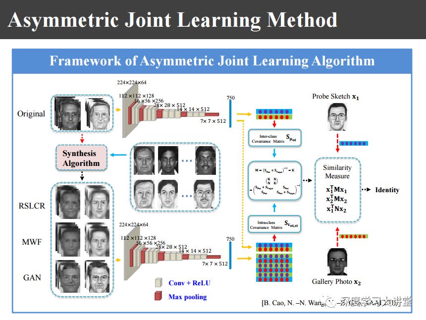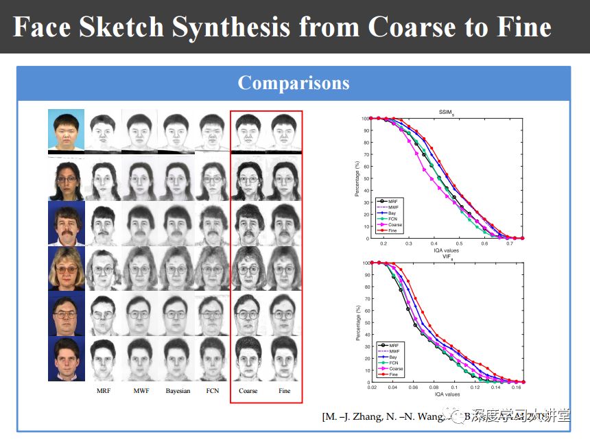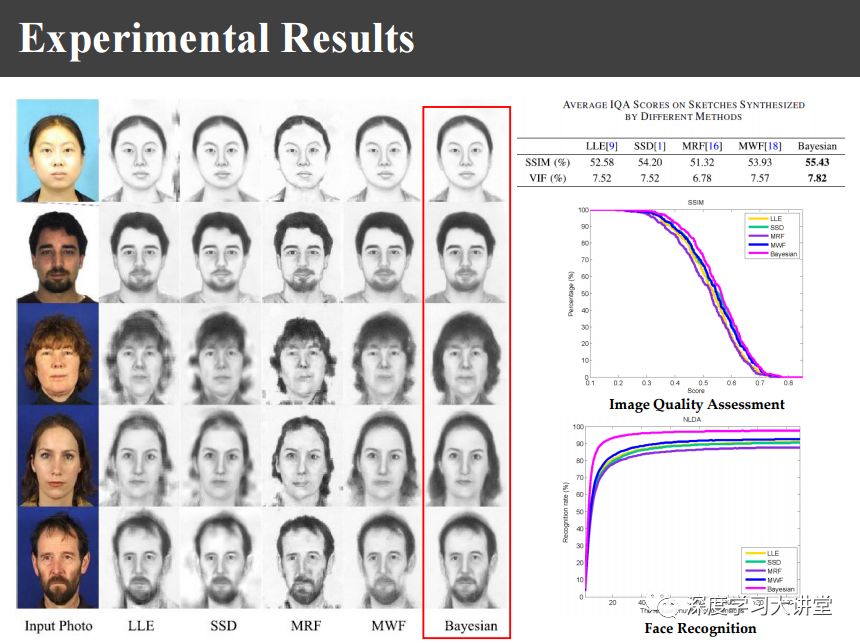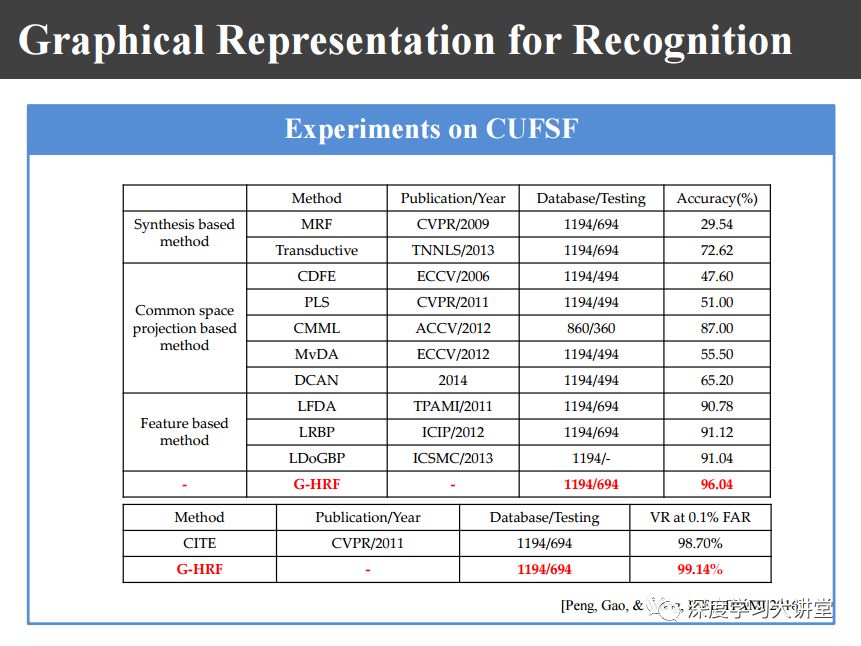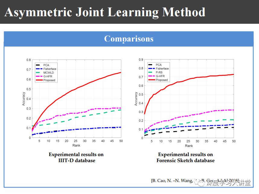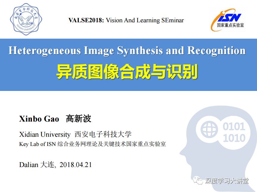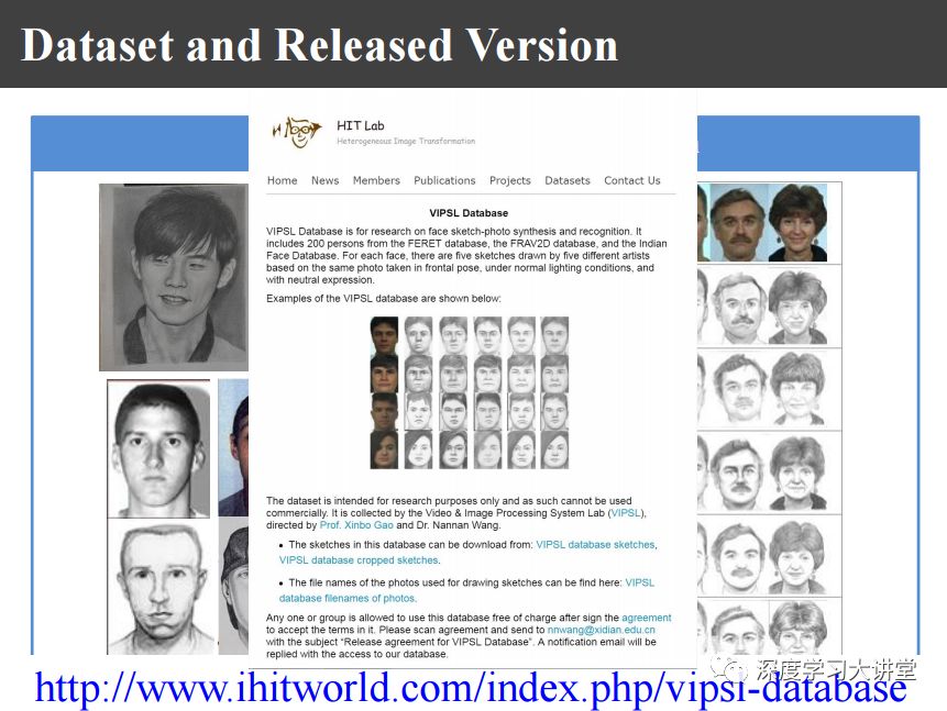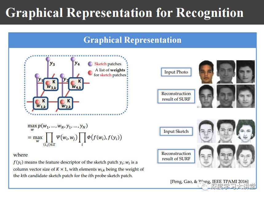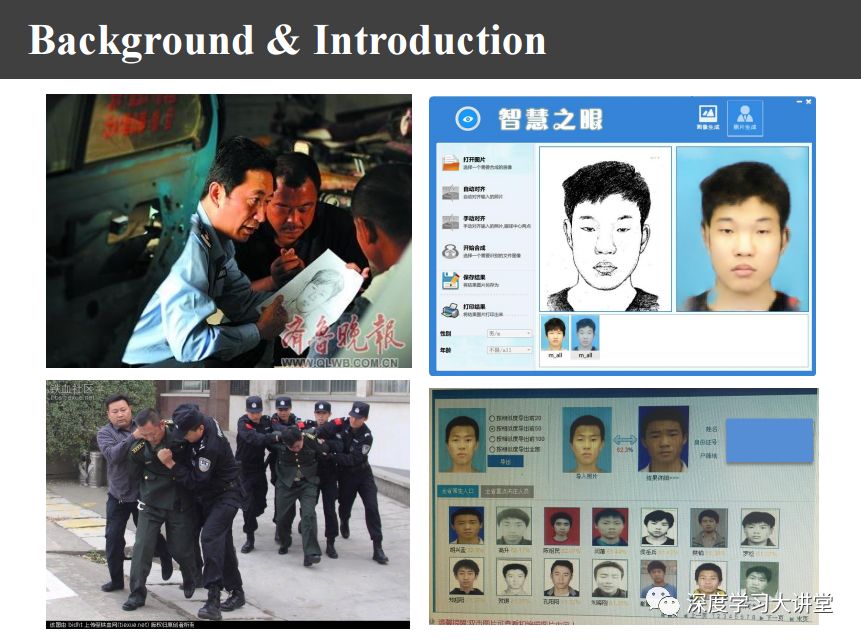 上图就给出不同特征的贡献程度,越亮的话就表示这个特征起的作用越大,越暗表示起的作用越小。 上图是我们由照片生成的画像,其他方法由于背景不一样可能会生成一些伪的背景。 同样我们可以由画像生成照片,上图是我们的实验结果。 可能对其他的照片我们的视觉不一定敏感,对于名人的照片一般都比较敏感。上图是对于一些明星的照片合成的画像结果,其他方法可能都有一些伪的阴影出现。 上图表示在用其他描述方法上我们的识别率都达到97%左右。 深度学习来了,前面的工作都是前些年做的,我们也不能免俗也要利用一下深度学习。刚才的特征提取方法完全可以换成CNN的方式来提取特征,然后再来进行描述,效果也是不错的。 利用16层VGG网络提取特征以后,将特征加权和合成权值优化以后构造相关的函数。 大家看一下上图,用了VGG以后,在寻找近邻块的时候性能往往比较稳定。利用灰度作为特征时近邻块可能会找错,而利用深度特征时就找对了,所以至少在这方面可以找到更好的近邻进行图像合成。 刚才我在分块的时候都是基于刘青山教授提出的均匀分块方法的。实际上均匀分块会分出上图所示的混合块,这个块既有眼睛又有眼睛以外的地方,既有头发还有皮肤,这样合成起来效果就会大打折扣了。 于是我们提出上图所示的基于超像素的自适应分块方法,使用超像素分割来进行分块,它的优点是更自适应了,缺点是原来的近邻非常规范,而现在每个块的邻域块可能数目都不一样了,需要将每个块的近邻块记录下来。 按照相同的方法构造目标函数,之后用基于概率图模型的方法即可生成画像。上面两张图分别展示了构造目标函数和概率图模型方法。 上图是我们生成的实验结果,从结果来看效果还是不错的。 上图是由画像生成照片的识别结果,我们的方法识别率达到了99%。 2017年的工作是把前面的相关工作进行了系统总结。我们发现整个算法流程基本上分为几个模块:对于给定的训练数据库,首先要对每一幅照片-图像对进行分块,进行图像块的描述,也就是说怎么来表示每一个图像块,另外就是近邻块的搜寻,怎么来寻找最近邻图像块,另外是怎样优化加权的权值W。 整个过程里面有两个部分需要优化,一个是对邻域块的搜索,一个是进行权值的计算。针对这两个模块,前面的工作只是对权值计算利用了概率图模型,而邻域图像块的搜寻同样可以利用概率图模型来优化。 关于异质图像识别是这样的,前面的方法基本上是首先将异质图像通过合成转化为同质图像以后再进行识别。其实完全不必这样,可以直接在特征域进行比对,比如,用概率图模型表示以后,可直接基于概率图模型的表示进行匹配识别。 也就是说来一个图像以后,用概率图得到它的表示系数之后,对异质图像之间的表示系数进行匹配就可以了,这个工作发表在16年的TPAMI上。 这篇文章的主要工作是构造了similarity的一个计算方法,当我们用上面所示的概率图模型表示图像块的时候,由于基图像不一样,所以必须首先找到基图像一样的系数进行相似性测度的构造,通过这样构造以后就可以直接利用表示系数的相似性进行识别了。 上图是不同的数据库,包括香港中文大学的CUFS和CUFSF数据库,印度的IIIT数据库,网上的数据库,照片、可见光和近红外的数据库,可见光和热红外的数据库。这里所谓的异质图像是指不同传感器得来的图像。 上图是我们在不同数据库上实验所得到的识别率。我们在香港中文大学数据库已经达到100%的识别率,加了Forensic数据库之后变成了99%,在identification上面是96%,在verification上得到99%的识别率。 上图是在IIIT数据库上的识别结果。识别率只有不到30%,因为这个数据库中的画像都是基于记忆而绘制的画像,画像和照片之间对齐的非常不好。 上图是在Forensic数据库上的识别结果,我们的方法得到最好的结果,也不过30%。 刚才的方法都是基于data-driven,下面来介绍基于model-driven的异质图像合成和识别方法。 上图是一个基于线性模型的方法,基于Ridge Regression脊回归的简单工作。给定一幅图像之后,我们首先进行区域划分,分成头发区域和人脸区域,对于头发区域利用mini batch K-means算法进行聚类,聚类以后对类内进行脊回归;对于人脸区域仍然找它的近邻,眼睛找眼睛区域,鼻子找鼻子区域,对每个区域基于位置进行脊回归,然后把两部分回归的结果进行组合之后就可以得到合成的画像。 上图是整个合成过程的框图。为了获得更为清晰的结果,也可以增加高频增强模块,即针对给定图像的高频部分也进行类似的异质图像合成。 上图是使用了高频增强和没有使用高频增强所得到的合成图像的对比。 我们方法的特点是速度非常快。因为使用了脊回归,有回归函数以后,对于新来的图像直接做回归,结果就直接产生了。同样的算法也可以用在超分辨重建上,用在超分辨重建上以后也可以得到很好的结果。因为从本质上来看两个问题是一致的。 基于非线性回归的方法当然就是基于最近比较热的基于深度神经网络的方法。 最近,大家都比较熟悉所谓的基于端对端的学习,还有上图基于conditional GAN的方法。不管是照片还是画像,把它映射到另外的异质图像域里,在这个图像域计算它的重建损失reconstruction loss。 后来UC Berkeley的朱俊彦博士提出了上图的CycleGAN,对照片或者图像映射到异质图像域以后