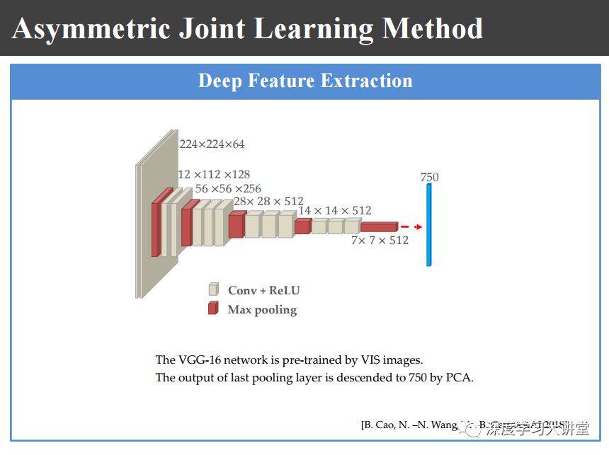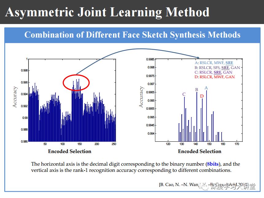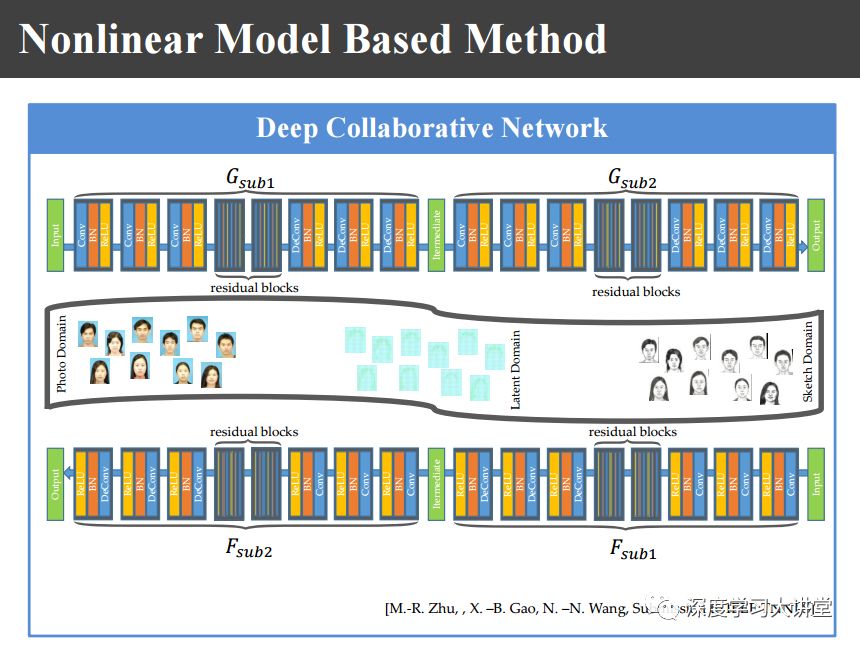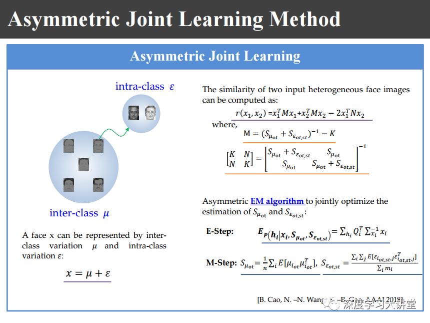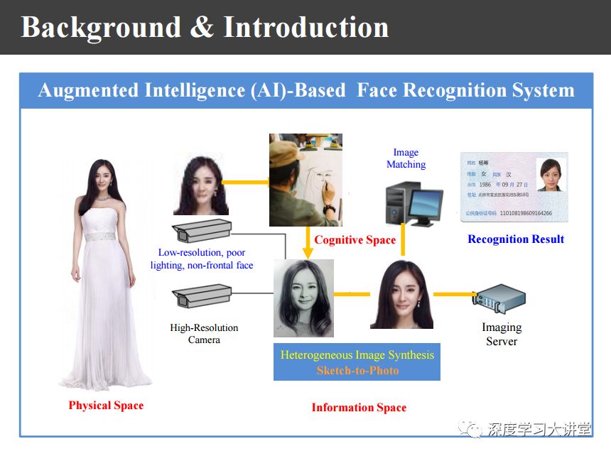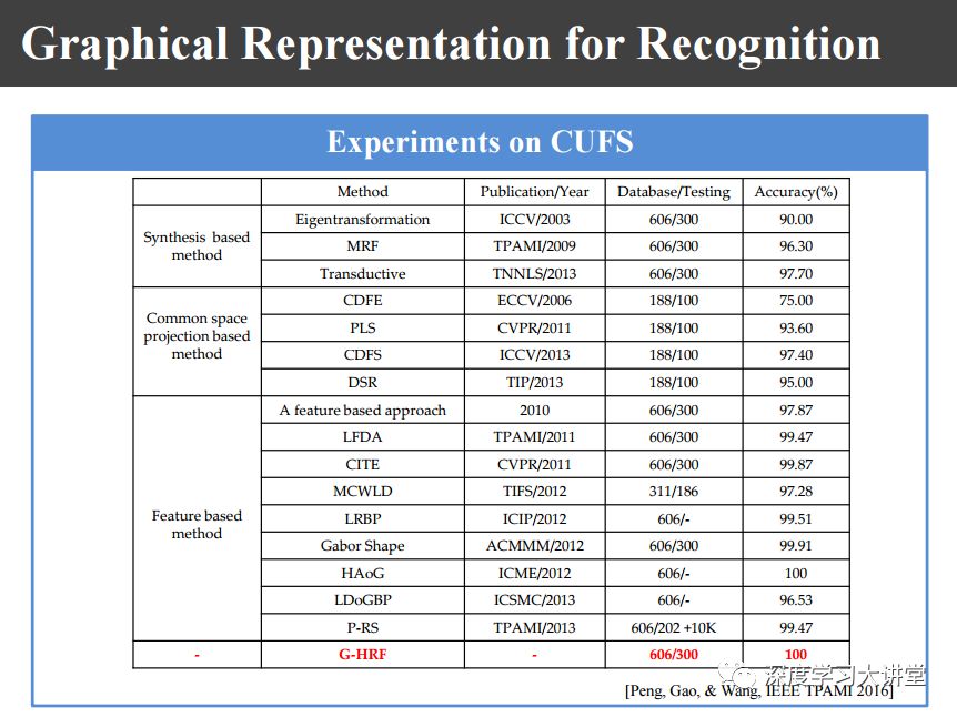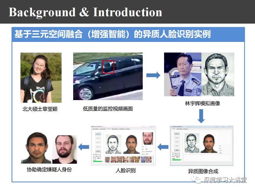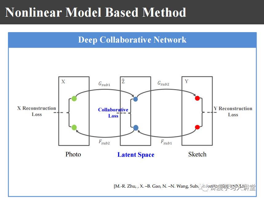 上图就给出不同特征的贡献程度,越亮的话就表示这个特征起的作用越大,越暗表示起的作用越小。 上图是我们由照片生成的画像,其他方法由于背景不一样可能会生成一些伪的背景。 同样我们可以由画像生成照片,上图是我们的实验结果。 可能对其他的照片我们的视觉不一定敏感,对于名人的照片一般都比较敏感。上图是对于一些明星的照片合成的画像结果,其他方法可能都有一些伪的阴影出现。 上图表示在用其他描述方法上我们的识别率都达到97%左右。 深度学习来了,前面的工作都是前些年做的,我们也不能免俗也要利用一下深度学习。刚才的特征提取方法完全可以换成CNN的方式来提取特征,然后再来进行描述,效果也是不错的。 利用16层VGG网络提取特征以后,将特征加权和合成权值优化以后构造相关的函数。 大家看一下上图,用了VGG以后,在寻找近邻块的时候性能往往比较稳定。利用灰度作为特征时近邻块可能会找错,而利用深度特征时就找对了,所以至少在这方面可以找到更好的近邻进行图像合成。 刚才我在分块的时候都是基于刘青山教授提出的均匀分块方法的。实际上均匀分块会分出上图所示的混合块,这个块既有眼睛又有眼睛以外的地方,既有头发还有皮肤,这样合成起来效果就会大打折扣了。 于是我们提出上图所示的基于超像素的自适应分块方法,使用超像素分割来进行分块,它的优点是更自适应了,缺点是原来的近邻非常规范,而现在每个块的邻域块可能数目都不一样了,需要将每个块的近邻块记录下来。 按照相同的方法构造目标函数,之后用基于概率图模型的方法即可生成画像。上面两张图分别展示了构造目标函数和概率图模型方法。 上图是我们生成的实验结果,从结果来看效果还是不错的。 上图是由画像生成照片的识别结果,我们的方法识别率达到了99%。 2017年的工作是把前面的相关工作进行了系统总结。我们发现整个算法流程基本上分为几个模块:对于给定的训练数据库,首先要对每一幅照片-图像对进行分块,进行图像块的描述,也就是说怎么来表示每一个图像块,另外就是近邻块的搜寻,怎么来寻找最近邻图像块,另外是怎样优化加权的权值W。 整个过程里面有两个部分需要优化,一个是对邻域块的搜索,一个是进行权值的计算。针对这两个模块,前面的工作只是对权值计算利用了概率图模型,而邻域图像块的搜寻同样可以利用概率图模型来优化。 关于异质图像识别是这样的,前面的方法基本上是首先将异质图像通过合成转化为同质图像以后再进行识别。其实完全不必这样,可以直接在特征域进行比对,比如,用概率图模型表示以后,可直接基于概率图模型的表示进行匹配识别。 也就是说来一个图像以后,用概率图得到它的表示系数之后,对异质图像之间的表示系数进行匹配就可以了,这个工作发表在16年的TPAMI上。 这篇文章的主要工作是构造了similarity的一个计算方法,当我们用上面所示的概率图模型表示图像块的时候,由于基图像不一样,所以必须首先找到基图像一样的系数进行相似性测度的构造,通过这样构造以后就可以直接利用表示系数的相似性进行识别了。 上图是不同的数据库,包括香港中文大学的CUFS和CUFSF数据库,印度的IIIT数据库,网上的数据库,照片、可见光和近红外的数据库,可见光和热红外的数据库。这里所谓的异质图像是指不同传感器得来的图像。 上图是我们在不同数据库上实验所得到的识别率。我们在香港中文大学数据库已经达到100%的识别率,加了Forensic数据库之后变成了99%,在identification上面是96%,在verification上得到99%的识别率。 上图是在IIIT数据库上的识别结果。识别率只有不到30%,因为这个数据库中的画像都是基于记忆而绘制的画像,画像和照片之间对齐的非常不好。 上图是在Forensic数据库上的识别结果,我们的方法得到最好的结果,也不过30%。 刚才的方法都是基于data-driven,下面来介绍基于model-driven的异质图像合成和识别方法。 上图是一个基于线性模型的方法,基于Ridge Regression脊回归的简单工作。给定一幅图像之后,我们首先进行区域划分,分成头发区域和人脸区域,对于头发区域利用mini batch K-means算法进行聚类,聚类以后对类内进行脊回归;对于人脸区域仍然找它的近邻,眼睛找眼睛区域,鼻子找鼻子区域,对每个区域基于位置进行脊回归,然后把两部分回归的结果进行组合之后就可以得到合成的画像。 上图是整个合成过程的框图。为了获得更为清晰的结果,也可以增加高频增强模块,即针对给定图像的高频部分也进行类似的异质图像合成。 上图是使用了高频增强和没有使用高频增强所得到的合成图像的对比。 我们方法的特点是速度非常快。因为使用了脊回归,有回归函数以后,对于新来的图像直接做回归,结果就直接产生了。同样的算法也可以用在超分辨重建上,用在超分辨重建上以后也可以得到很好的结果。因为从本质上来看两个问题是一致的。 基于非线性回归的方法当然就是基于最近比较热的基于深度神经网络的方法。 最近,大家都比较熟悉所谓的基于端对端的学习,还有上图基于conditional GAN的方法。不管是照片还是画像,把它映射到另外的异质图像域里,在这个图像域计算它的重建损失reconstruction loss。 后来UC Berkeley的朱俊彦博士提出了上图的CycleGAN,对照片或者图像映射到异质图像域以后