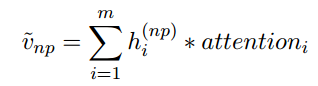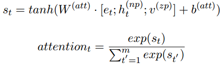 这里的softmax()被用在矩阵维度的第二维度,注意力矩阵A 即可被当做一种对零代词上下文的多层注意力表示。最后,我们将其相乘得到零代词的表示( 和 )。 2.2.2 候选先行语建模 我们有了零代词的表示 ,利用其对一个后选先行语的每个词进行注意力计算。特别的,注意力的计算公式为 :