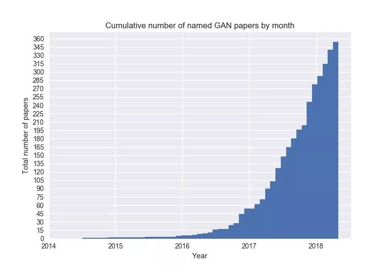 由于GAN在深度学习领域的火热,与GAN相关的论文也是层出不穷。过去三年里,光是名字中带有GAN的论文就呈现出指数型增长态势。