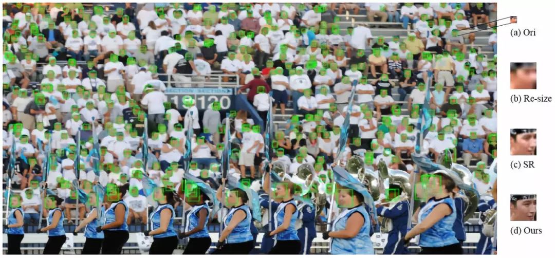 另外,GAN还可以被用于小脸检测。对于图片中我们感兴趣的区域,可以利用GAN来进行放大,从而更好地判断该区域是否存在人脸,提升小人脸检测的准确率。如下图中CVPR 2018论文"Finding Tiny Faces in the Wild with Generative Adversarial Network"结果所示。 论文链接:https://ift.tt/2v7ypmi