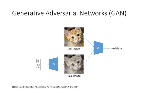 为了实现这样的运动追踪,他们提出了Frank模型和Adam模型两个模型,Frank模型可以将人体各部位的模型进行局部组合,并能通过单个无缝模型完整表达人体部位的动作,包括人脸和手的动作。Adam模型与初始模型具备同样的基础层级,但是它可以表现头发和衣服的几何形状,直接查看衣服和人是否相配。两个模型结合在一起不仅可用于整体动作追踪,而且可以同时捕捉一个人的大规模身体动作和细微的面部、手部动作。 论文链接:https://ift.tt/2LmhiYO 在本届CVPR的参会论文中,生成对抗网络(GAN)是引人关注的一大热门技术,被应用于图片合成、风格迁移、小脸检测、图片去雾等越来越多的问题中。生成对抗网络由Ian Good fellow首先提出,在近四年的发展中,GAN在越来越多的领域中发挥着至关重要的作用,越来越多的人认为GAN正在取代深度学习,成为新的关注焦点。 GAN由生成网络G和判别网络D两个网络构成。在训练过程中,判别网络D尝试对生成网络G生成的图片和真实图片进行分类,生成网络G则尽可能使自己生成的图片接近真实图片,使判别网络D难以辨别生成图片和真实图片,这样就形成了对抗的局面,最后的训练结果是判别网络D无法辨别生成网络G生成的图片,生成网络G生成图片的数据分布和真实数据的分布达到一致。GAN网络原理如下图所示。