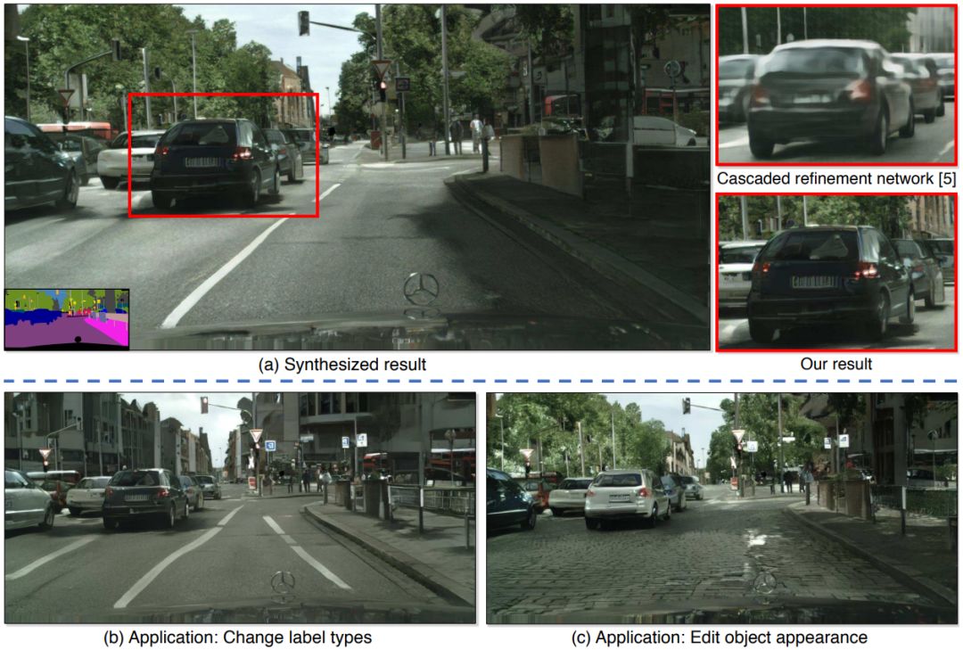 其次,GAN可以用于转换存在对应关系的图片。例如将标签转换为实景,将灰度图片转换为彩色图片,将航拍地图转换为二维地图等等。 下图是CVPR 2018论文"High-Resolution Image Synthesis and Semantic Manipulation with Conditional GANs"的结果,从街景标签到街景实景的生成过程使用了由粗粒度到细粒度的思想,先生成低分辨率的图片,然后再逐步生成高分辨率的图片。 论文链接:https://ift.tt/2AAPrOd
