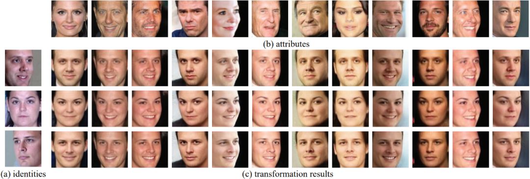 其中,I网络用来提取图片的身份信息,A网络用来提取网络的属性信息,G通过提取的信息生成一张新的图片,C网络用来保证生的图片和提供身份信息的图片的身份信息一致,D网络用来保证生成的图片是一张真实的图片。 通过在MS-Celeb-1M上的训练,我们的模型能够在开放数据集上生成保持身份信息的图片。在开放数据集上得到的结果如下图所示: