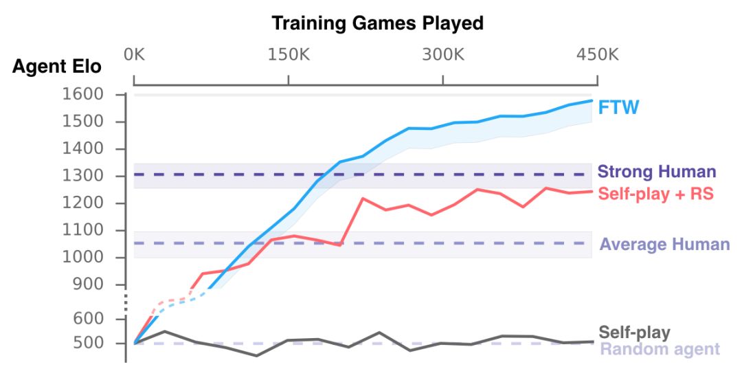早期的一场 CTF 测试比赛,比赛双方为经过训练的智能体与人类玩家组成的队伍。 FTW 智能体变得比强基线方法更强大,并且超过了人类玩家的胜率。事实上,在一项对参与者的调查中,它们被认为比人类玩家更具合作性。