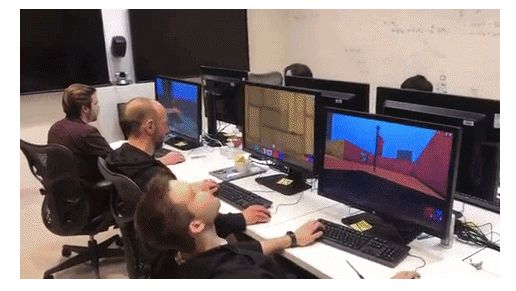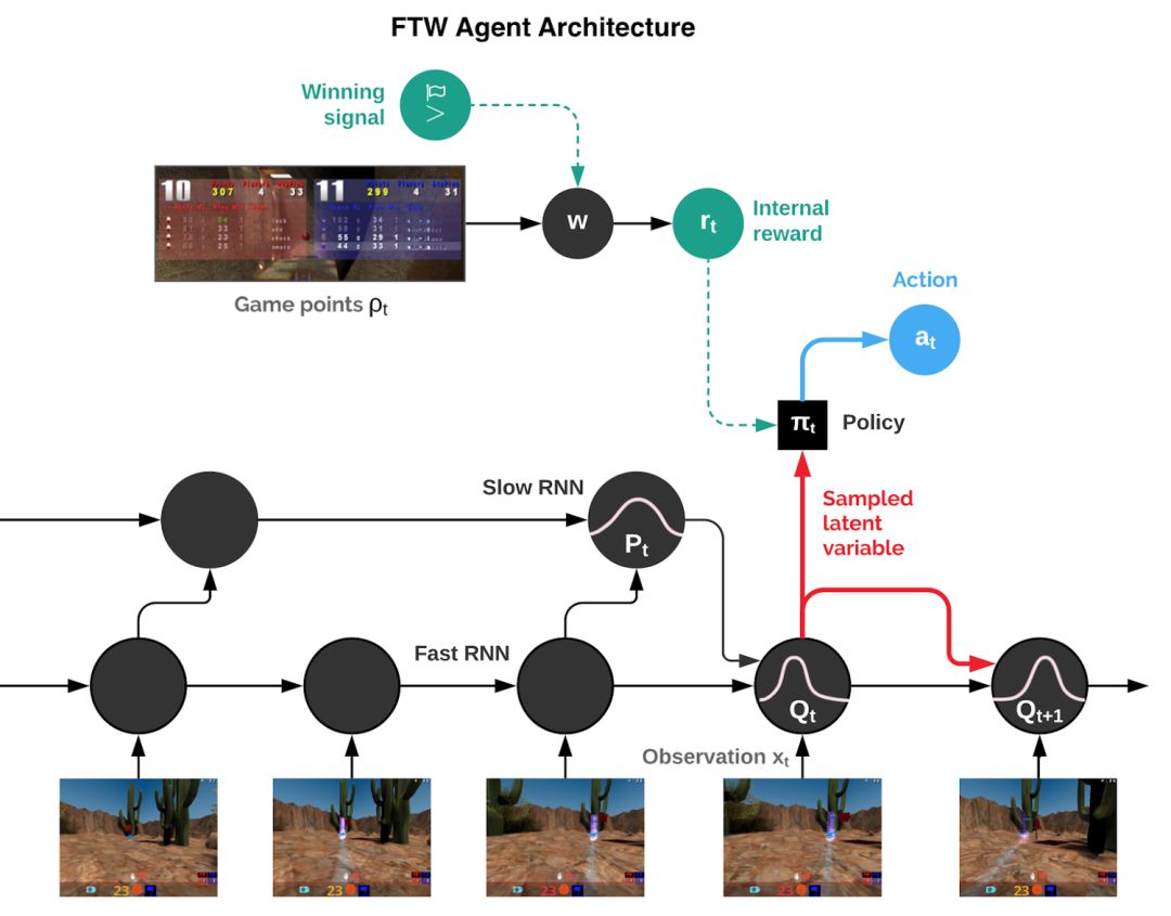 FTW(for the win)智能体架构示意图。该智能体结合了快速和慢速时间尺度上的循环神经网络,包括共享记忆模块,并学习从游戏点到内部奖励的转换。 由此产生的智能体被称之为 FTW 智能体,学会了以非常高的标准玩 CTF。至关重要的是,学习到的智能体策略对地图的大小、队员的数量以及团队中的其他玩家都是稳健的。接下来,你可以探索一些户外程序环境中的游戏(其中 FTW 智能体相互对战),以及人类玩家和智能体在室内程序环境中一起玩的游戏。