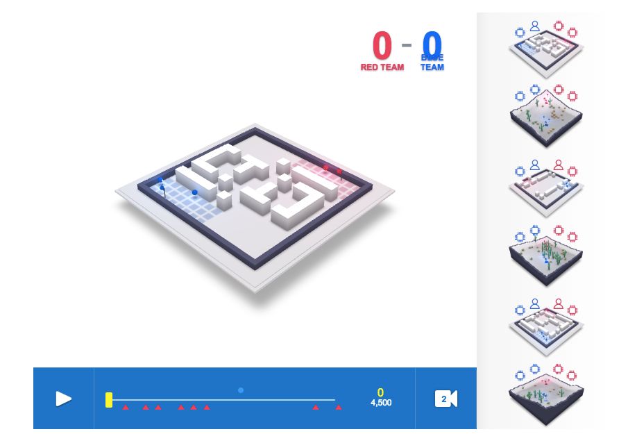 交互式 CTF 游戏浏览器,具有程序生成的室内和户外环境中的游戏。户外地图上的游戏是 FTW 智能体之间的游戏,而室内地图上的游戏是混合了人类玩家和 FTW 智能体的游戏(见图标)。 DeepMind 举办了一场包括 40 名人类玩家的比赛,在比赛中人类和智能体随机配对——既有可能成为对手,也可能成为队友。