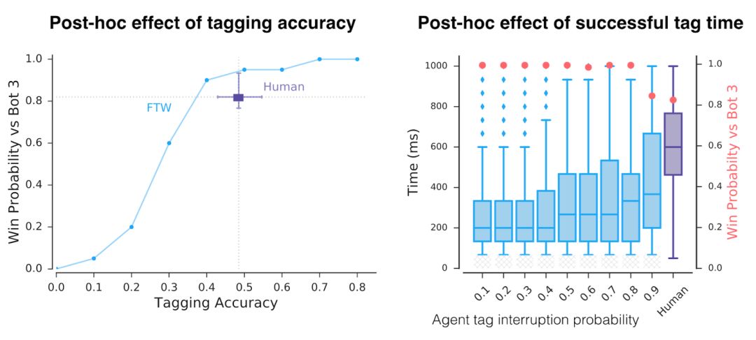 在训练之后人工减少智能体的命中率和反应时间的效果。即使在和人类相近的准确率和反应时间上,DeepMind 智能体的表现也优于人类。 通过无监督学习 DeepMind 建立了智能体和人类的原型行为,发现智能体实际上学习了类似人类的行为,例如跟随队友和在敌人的基地扎营。