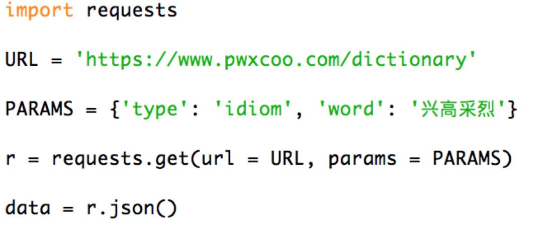 请求拼音首字母缩写,也需要两个参数: type=idiom 表示需要请求成语 word=xgcl 表示请求的成语拼音首字母缩写 下面文摘菌用Python简单实现了一下: