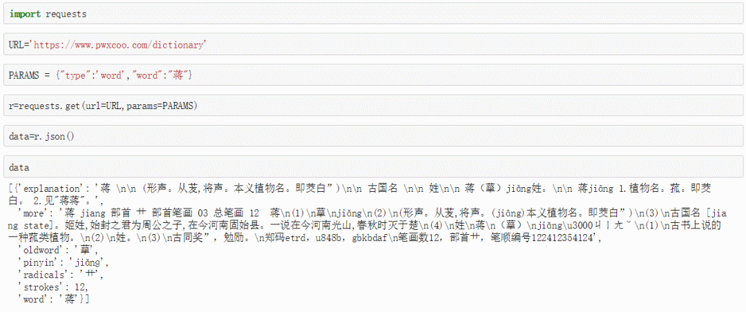 由上图的Python实现可知,当你输入的关键词是模糊的时候,结果会返回带有关键词的所有歇后语。例如,你查询关键词为王婆的歇后语,返回了三条结果,每条结果包含歇后语的迷面以及歇后语的谜底。 当需要访问汉字的时候,当前接口只能直接请求汉字,不能请求拼音。如果请求了拼音,则返回的结果为空。 请求汉字需要两个参数: type=word 表示需要请求汉字 word="蒋" 表示请求的汉字 Python实现👇 如上图所示,当请求'蒋'这个汉字的时候,返回的结果包括汉字的拼音、汉字的来源、以及汉字的繁体版等等。