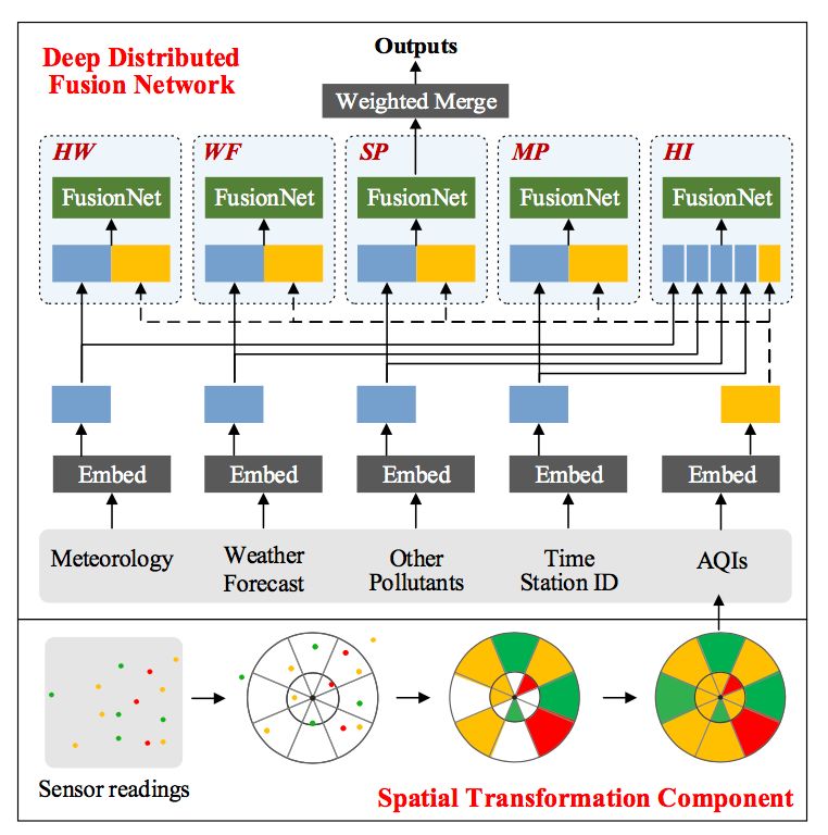 智能空气质量预测 虽然深度学习算法近年在处理图像、语音、自然语言等领域展现了强大的能力,但并不是所有的问题都适合用深度学习来解决。在城市计算中,什么样的问题适合引入深度学习?同样是 KDD 2018 的入选论文,「基于深度分布式融合网络的空气质量预测」,就是一个数据量的质变为深度学习的进入提供空间的例子。 我国于 2012 年开始对 PM2.5 进行监控,在 5 年前,可用数据点只有几千个,小样本问题是进行预测的一大障碍。如今,全国有超过 200 个城市、数千个站点在以小时为单位记录空气质量数据,数据量的极大丰富让研究者思考深度学习能否更好地解决问题。研究者发现深度学习在拐点预测方面有较大提升。 空气质量预测既需要考虑到大颗粒悬浮物,也要考虑污染物,是一项「既要看天,也要看人」的时空细粒度预测,它影响因素众多,且不可直接观测,需要应用机器学习模拟诸多影响因素的变化。在空气质量预测中,拐点预测尤为重要:它与工厂停工、学生停课等城市管理决策执行息息相关。 在深度学习处理时空数据时,数据转化和属性捕捉是两大重点。深度分布式融合网络设计了针对空气质量指数的特定的数据归集合并的方法,进行数据维度对齐和滤噪,然后把气象、 天气、其他污染物等因素引入,进行嵌入(embedding)后,利用不同的融合网络分别学习 AQI 受整体和各因素分别的影响权重,最后得出预测结果。这种方法很好地捕捉了空气质量骤变。准确率提高到接近 50%。