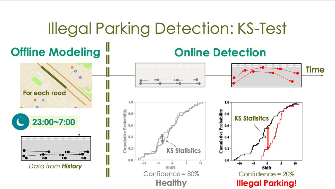 大数据平台定义了六种标准数据,并对所有城市数据进行分类。按照数据结构进行划分,数据可分为点数据和网数据。按照数据关联的时空属性,数据可以分为时空静态、空间静态时间动态以及时空动态数据。这两个分类标准交叉形成了六种数据类别,城市里存在的所有数据都可以被归类其中。数据的标准化意味着数据通用性的增强,也让系统变得可扩展。 城市计算平台则将时空数据特殊的索引算法和分布式结合,获得性能百倍乃至千倍的提升。京东每天新增数据超过 800 TB,如果没有底层支撑,就没有办法实时运行很多算法。 智能交通 在平台之上是各个应用板块,包括智能交通、智能环保、智能商业等,在为每一个城市制定项目时,都是从板块里提取过去的经验进行扩展与复用。 在论坛中反响非常好的一个例子是京东金融与摩拜合作的智能交通项目,KDD 2018 入选论文「用共享单车轨迹检测违章停车」。项目的逻辑很简单:违章停车会影响自行车的骑行线路,如果在某一路段获得了大量符合一定模式的骑行数据,就可以对当前路段是否有违章停车进行预测。在不增加交警人力物力的情况下,进一步降低实际管理成本。 在第二天的论坛上,来自哈尔滨工业大学的何天赋介绍了这份工作。工作包括一个预处理模块,进行有针对性的相应轨迹清洗、路网匹配、轨迹索引;以及一个检测模块,基于假设检验与轨迹融合进行检测。 在预处理部分,通过路网匹配去掉了匹配到高速路等自行车罕至地域的轨迹、与道路几乎垂直的、偏离道路过远的轨迹,同时因为违章停车对正向和反向骑行的自行车影响程度不同,因此将轨迹按其行进方向分开,用不同的模型分别刻画。 在检测部分,作者主要强调三点考量: 1. 不区分不同模式的违章停车,将其全部视为一类。将其多样性内化。 2. 不检测单条轨迹,而是把不同轨迹合在一起进行一次判断,排除可能影响单条轨迹的诸多误差。 3. 对每条路单独建模,排除不同地区障碍物不同带来的 GPS 误差分布差异。 检测模型将深夜的自行车轨迹视为基线数据,然后用 KS 检验判断白天与深夜的样本是否处于同一个分布,输出一个属于同一分布的置信度,然后用真实违停检验数据集确定分类的阈值。