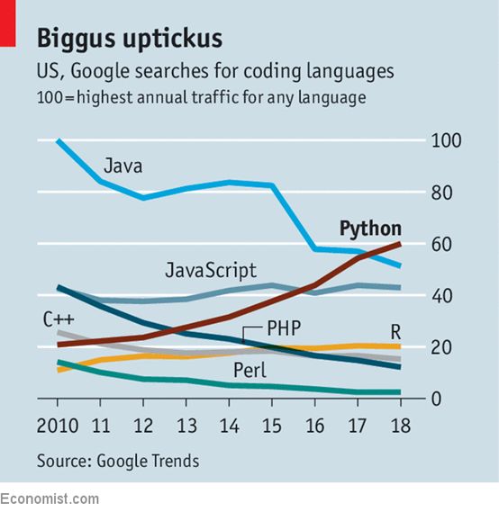 诞生于1989年12月,Python最初是荷兰计算机科学家Guido van Rossum为自己设立的一个的圣诞项目。 由于当时的其他编程语言都有各种缺点,这位科学家就想创建自己的编程语言。 而他建立编程语言的原则也很简单: 因此,他以英国喜剧团队Monty Python的名字来命名这种编程语言,而其软件包存储库被称为Cheese Shop。 在他的圣诞项目发明近30年后,Van Rossum先生就像电影《万世魔星》(又名《布莱恩的一生》)中的救世主一样,成为了技术界的Monty Python人物。他解释道:"我并没有打算创造一种适合大众消费的语言。" 但在过去的12个月里,美国谷歌用户搜索Python的频率比搜索电视网红金卡戴珊频率还要高。 经济学人的一张数据图来看,自2010年以来,Python的查询率增加了三倍,而其他编程语言的查询率则持平或呈下降趋势(见图表)。