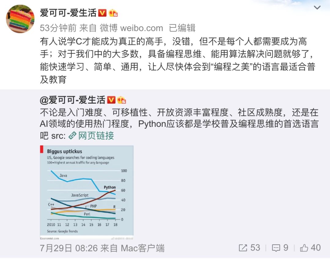 如上,微博中写到: 与人说学C才能成为真正的高手,没错,但不是每个人都需要成为高手;对于我们中的大多数,具备编程思维、能用算法解决问题就够了,快速学习、简单、通用,让人尽快体会到"编程之美"的语言最适合普及教育。