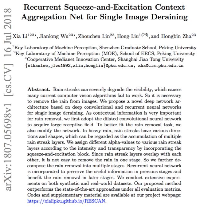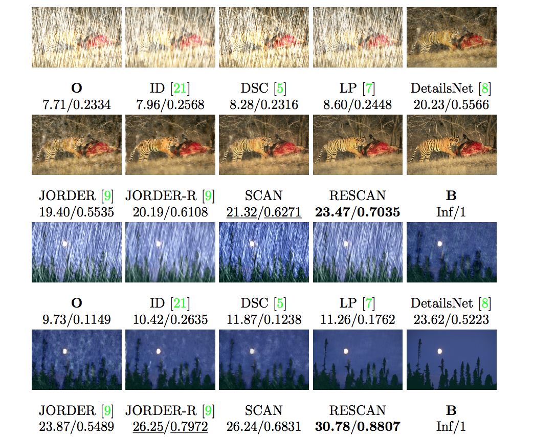 雨滴会严重降低能见度,除了给日常出行造成各种不便,也导致许多当前的计算机视觉算法都无法工作。特别是在大雨中,来自各个方向的雨水积累和使背景场景朦胧,严重影响比如视频监控,物体检测,以及在自动驾驶跟踪等方向的准确性。 因此,除去雨水并从雨水图像中恢复背景,是一项重要的任务。 其实在过去十年中,图像去除已经有了不少有趣的研究。 现有方法可以分为两类,包括基于视频的方法和单图去除方法。基于视频的方法可以利用视频中图片的关系框架,因此相对容易;相对而言,单图像去除更具挑战性。 在今年的雨季,来自北京大学和上海交通大学的几位研究者,针对"单图去雨"任务进行了研究,他们基于深度卷积和循环神经网络,建立了一种新颖的神经网络架构,并获得了不错的结果。 这一成果在ArXiv上发表,并已被ECCV(欧洲计算机视觉国际会议,计算机视觉三大会议之一)采纳。 除了论文成果,里边对之前各种关于单图去雨的历史研究论述总结颇为详细,在今天读来是个很应景的话题,感兴趣的同学可以自行下载👇