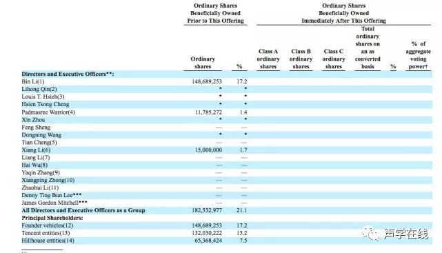在招股书中,蔚来创始人李斌持股17.2%,腾讯持股15.2%,高瓴资本持股7.5%,蔚来北美CEO Padmasree Warrior持股1.4%,车和家创始人李想持股1.7%。