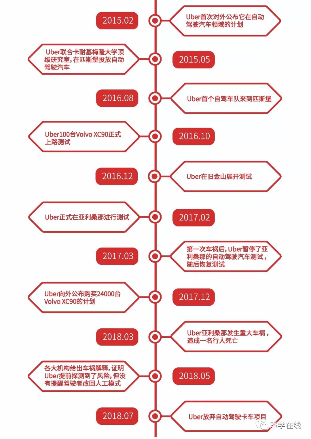 早期,匹斯堡的市长和Uber一拍即合,允许Uber100辆沃尔沃XC90上路。但太美的梦总是因为太年轻。Uber借着东风,大规模展开测试,结果最初几个月基本是踩着小型车祸和交通违章走过来的。 得了便宜还不满足,Uber开始为自动驾驶收钱,也收回了原本定好的要投给匹斯堡修整当地交通的5千万美元承诺。在老家旧金山,Uber的测试项目也被快速取缔,因为公司拒绝将汽车注册为测试车辆。 更坏的消息来自亚利桑那。2018年3月,Uber车祸这个致命一击让Uber立刻停止了所有城市中的自驾汽车的试验。在亚利桑那,按下的甚至不是暂停键,而是永久取消键。 直到现在,即使事情已经过去了半年,一键谷歌搜索和Uber自动驾驶相关的新闻,排在最前面的,除了该项目太费钱投资者不满之外,仍然是许多媒体对于Uber的谴责和愤懑。 值得一提的是,Uber之前并没有完全押注小轿车。从2016年开始,Uber正式开展了自动驾驶卡车的项目,然而后来卷入法律纠纷,车祸事件之后,Uber全部的试验在亚利桑那州被停止。直到今年暑期,Uber已经宣布放弃了自驾卡车项目。唯一保留下来的只有Uber Freight,一个将卡车和货物配对的公司。 这里提到的法律纠纷值得展开。2017年,争端开始于可能的技术盗窃。一个叫做Anthony Levandowski的谷歌前员工下载了一万四千多个秘密文件后辞职,开了一个叫Otto的创业公司。而该公司很快被Uber买下,价格在6800万美元。之后Uber小赔了一笔钱,这件事情就被按了下来。 然而不久,Waymo和Uber两家再次掐了起来一个Uber的供应商无意间给谷歌(可以理解为Waymo的母公司)抄送了一份邮件,邮件中含有电路板的信息,而谷歌看出来这和自家的电路板一模一样。这下谷歌直接将Uber告上了法庭。Uber态度十分强硬,表示这一切都是"毫无根据的,想要打压竞争对手的伎俩。" 经过一年的准备,2018年2月案子正式开庭。Uber直接怂了,赔给Waymo近2500万美元,息事宁人。车祸出人命,疑似盗窃别人技术,在公司荷包上捅一个大窟窿,这些都在隐隐暗示着Uber无人驾驶目前面临的危机。 反观其竞争对手Alphabet旗下的Waymo,近来却风头正盛。Waymo已经完成了800万英里的公共路面自动驾驶测试,并正在为今年底向公众推出无人驾驶服务做最后的准备。 今年5月,瑞银集团曾预测,到2030年,Waymo将占领全球无人驾驶汽车行业60%的市场份额。目前市场对Waymo 的估值已经高达 1750 亿美元。 除了Waymo以外,通用汽车 Cruise 、日产汽车等公司的无人驾驶研发也正逐步走向成熟。苹果、奔驰等大公司的无人驾驶业务也正在积极展开,还有无人车初创公司Zoox等也正在成为无人驾驶生态中的新生力量。 所以,彭博社的这一篇文章虽然算不上绝对严谨,但不无道理。比如说,这么多年,Uber拒绝将司机算作公司的正式员工。如果这么怕麻烦,何必去劳民伤财地搞一个自己的自动驾驶车编呢?更何况,按照彭博社的说法,全球这么多公司都在做自动驾驶,Uber大可以选择做一个平台,将自驾汽车和用户连接起来,而不必要非得啃硬骨头。 去年11月,Uber放出话来,要在2019-2021年之间买2万4千台沃尔沃XC90,如果真的买了,那么投入着实不小。毕竟,按照波士顿咨询集团的计算,一个正常的电动自驾汽车即使到了2030年也需要3万4千美元,想要以"白菜价"大量保有和运转这些车子,路遥且长。