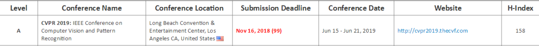 图注:2019 年 CVPR 会议信息 因 NIPS 2018、KDD 2018 等学术会议还未召开,因此部分会议是 2018 年的信息,如下: