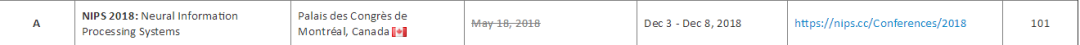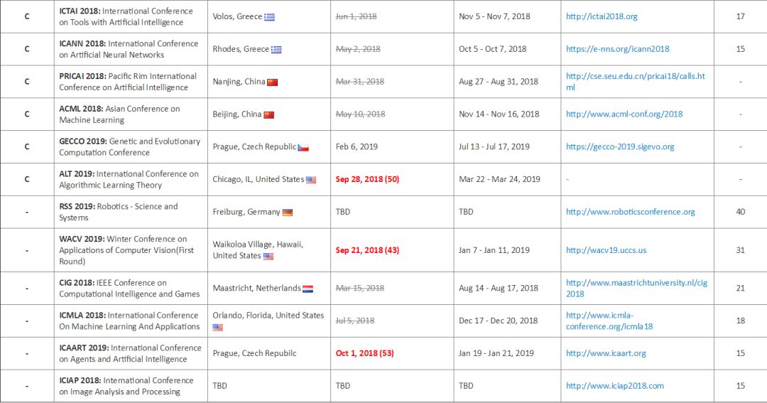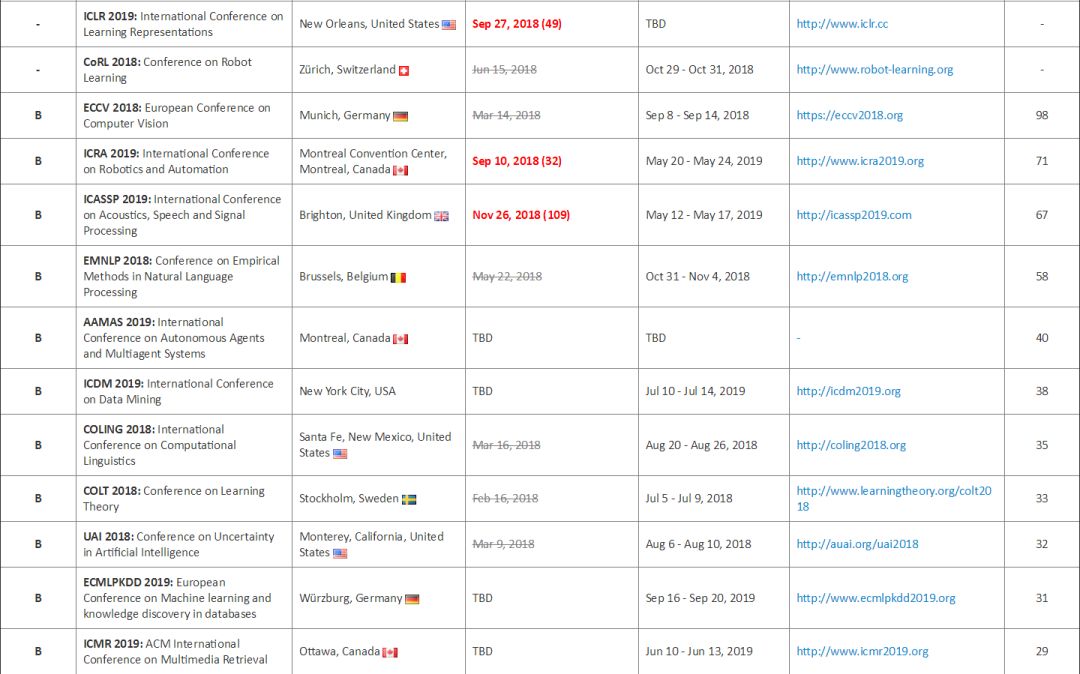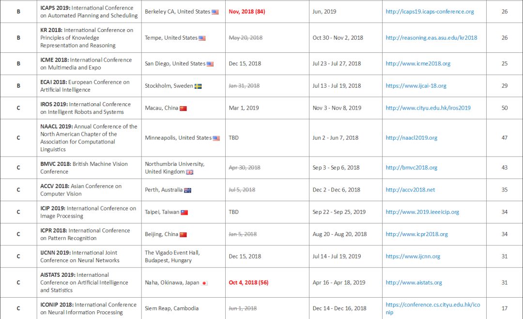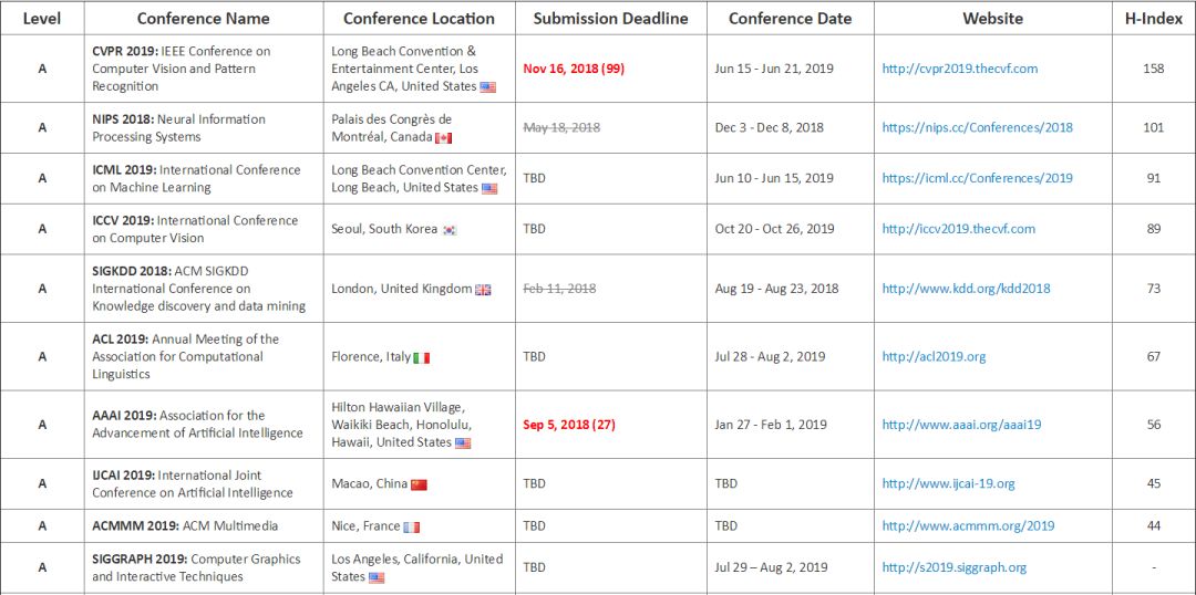 | 2018 年已经过去了 66% 左右,ACL、CVPR、ICML、ICLR 等学术会议也已经开完,众多学术圈的朋友们如今可能都在为 NIPS 2018 论文 rebuttal 而奋战,但是不是更多的人在为 2019 年的学术论文而做准备? 除了学术界,产业界在学术会议中也越来越活跃,需要紧跟学术会议步伐来招人、做技术宣传。 因此我们把这份由 THU F205 CV Lab Jackie Tseng 同学更新的 2018-2019 人工智能、计算机视觉、数据挖掘与 NLP 领域学术会议时间列表推荐给大家,明年的学术会议参与规划就看它了。 该列表最新一次更新是 7 月 25 日,栏目包括 A、B、C 三类学术会议名称、举办时间/地点、截稿日期、官网、H-index 指数。