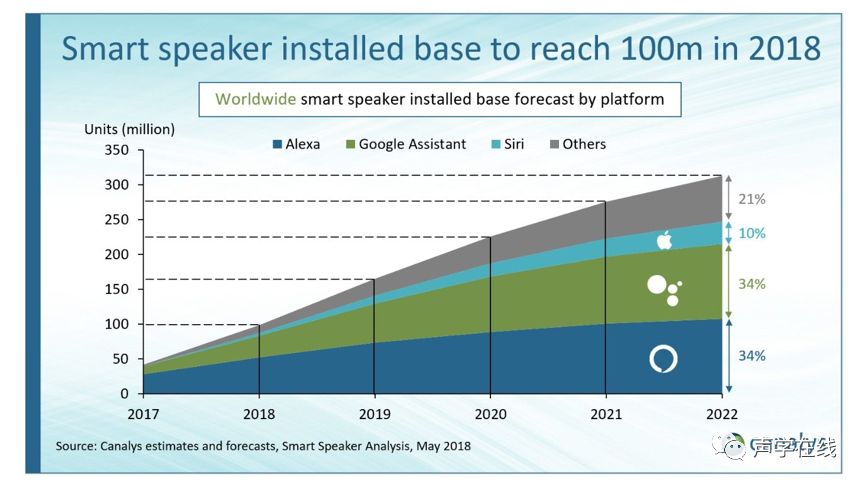 | 上周,声学在线写了国内智能音箱竞争的白热化程度,今天,美国的数据也来了。 来自 CIRP 的最新数据显示,美国家庭智能音箱的安装量已经达到了 5000 万,其中包括 Amazon Echo、Google Home以及 HomePod。 这其中,CIRP 预测,HomePod 的市场占有率为 6% 左右,这意味着 HomePod 在美国的销量为 300万左右。数据统计的截止日期为 6 月 30 日。