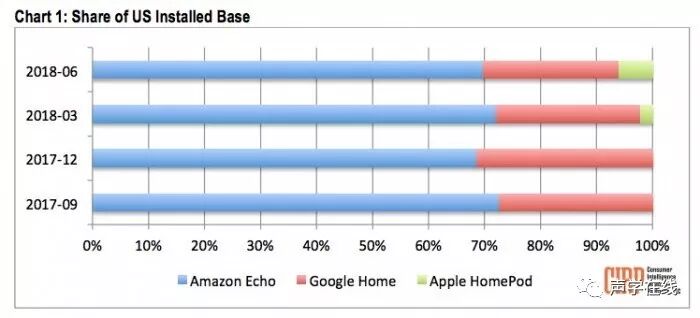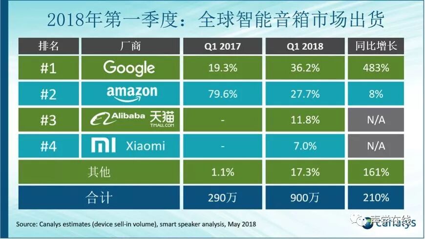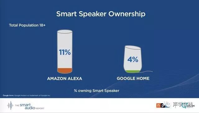 更早之前,今年1月份,《The Smart audio Report》报告显示,2018年1月同比2017年1月,美国智能音箱用户数增加了128%,去年同期占据市场主导地位的是亚马逊一家,而今年谷歌也开始强势进入。