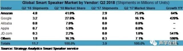 国内的市场也同样热闹,先是百度宣布低价秒杀小度智能音箱、搭载DuerOS的智能设备激活数量突破一亿台,昨天小米也宣布小爱同学月活跃设备超过 3000 万。 昨晚同时发力的还有阿里和三星。前者开始以399的价格销售天猫精灵磨合,后者则在新发布的Note9中大力推荐语音助手,并宣布发力智能家居领域。 智能音箱以及其背后智能语音助手的市场竞争,再一次进入了沸腾的白热化阶段。 在2018年第二季度,亚马逊依然稳坐智能音箱第一的位置,出货量达到480万台,占全球市场份额为41%;而去年同期,亚马逊的销量为290万台,市场份额则是75.8%;紧随其后的谷歌,Home、HomeMini和Home Max的销量合计达到了320万台。这让谷歌获得了27.6%的市场份额,相对而言,在2017年第二季度这个数字仅为16.1%。 这两个市场领导者加在一起,现在只占有了69%的市场份额;而在2017年第二季度,前两个市场领导者占有超过90%的市场份额。 由此可以看出,不断的后来者正在进入智能音箱的市场,并不断地挤占亚马逊和谷歌的市场份额。比如阿里,阿里在本季度继续稳坐第三名,出货量达到了80万台,市场份额7%。 同样作为后进者的苹果,在今年第二季度的数据统计中,勉强挤进了第四的位置,本季度大约售出70万个HomePods,比第一季度的60万台销量略高,市场份额也从零增长到了5.9%。 小米、百度、京东也在这个日益拥挤、竞争日益激烈的行业里迅速崛起。