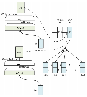 图4 引入上下文信息帮助指代消解 另一篇论文Document Context Neural Machine Translation with Memory Networks中,作者将文档级的机器翻译任务视作结构预测问题,通过构造源语言端和目标语言端的两个记忆网络(memory networks),来存储源语言文档和目标语言文档中句子之间的依赖关系,解码器将记忆网络中的存储信息作为条件进行解码,模型结构如下图所示。通过这个方法,模型可以更好地利用上下文信息,帮助解码器更好地进行指代消解等。实验结果表明,该方法的性能相比之前的工作有显著提升。