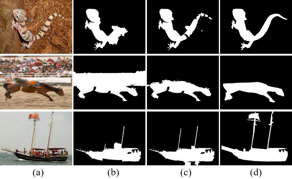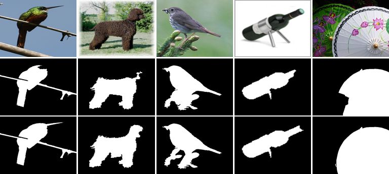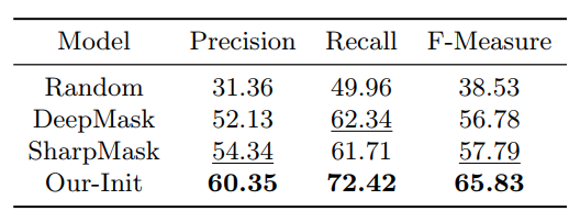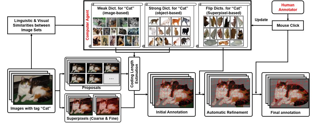 ▲ 图1. 论文整体框架 机器自动化机器自动化标注主要利用稀疏编码的思想,对待标注图像进行编码,编码长度的大小就意味属于前景物体的可能性大小,选择一个阈值分离前背景就能得到自动化标注结果。对于机器初始化标注,作者首先构建了两个字典:强字典、弱字典,将这两个字典作为稀疏编码图像的码表。 字典构建 首先根据每一类图像的语义标签计算语义相似性,然后根据图像特征计算每类图像之间的视觉相似性,联合得到每类图像之间的总相似性。选择相似性大于 0.95 的类别作为当前类别的稀疏编码字典。有像素级标注图像类别的特征的作为强字典,没有像素级标注图像类别特征的作为弱字典。 稀疏编码 编码对象是用 MCG 算法对图像提取出来的排在前 200 的图像 proposal。由于图像的分辨率和像素密度很高,作者为减少人工点击次数,借助超像素块进行操作。作者把 proposal 编码长度映射到超像素块并归一化得到每个超像素块的属于前景的可能性值,选择大于 0.4 的作为前景,剩下的作为背景,得到机器初始化结果。 人工修正根据机器初始化结果,标注者进行修正:如果前后背景错误直接点击左键,如果边缘分割错误,首先点击右键进行分裂成更小的超像素块,然后点击左键。在人工修正的过程,机器会自动保存点击超像素块的 3 邻域特征用于后续的机器自动修正。 机器自动修正选择在阈值 0.4 上下 0.15 范围内的超像素块,用人工修正保存的超像素块 3 邻域特征进行稀疏编码,得到这些超像素块的编码长度,归一化选择大于 0.95 的超像素块进行前景背景在初始化基础上进行反转。得到机器自动修正结果。随着人工标注的结果越多,机器能学的越精确,自动化修正结果会更好。 实验本文选取了 40 个图像类别。在 ImageNet 数据集 1000 类中并且和 MSCOCO 有相同标签的 10 个类别、在 ImageNet 数据集 1000 类中并且和MSCOCO有不同标签的 10 个类别、不在 ImageNet 数据集 1000 类中并且和 MSCOCO 有相同标签的 10 个类别,不在 ImageNet 数据集 1000 类中并且和 MSCOCO 有不同标签的 10个 类别。 作者选择 10 个年龄在 20-28 周岁之间的标注者进行标注,每个标注者用 LabelMe 进行标注 4 个图像类别。得到 LabelMe 的标注结果,作为本文的 ground-truth。 为了比较作者方法的自动分割结果,作者和当前自动分割处于领先水平的两个方法:DeepMask 和 SharpMask 进行比较。发现这两个方法的结果都明显低于 Colt 的初始化结果。具体结果见图 2。