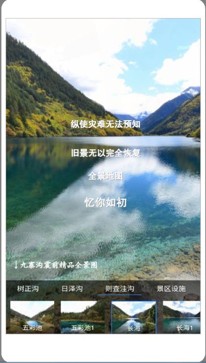 上帝的后花园 就在你小小的手机中 精品全景地图将九寨沟景区以"树正沟、日则沟、侧查洼沟"及"景区设施"四个相册进行全景叙事。只要进入 H5,就可以看到九寨沟震前的原始风貌,让小伙伴们体会到什么叫"上帝的后花园"级别的美景。