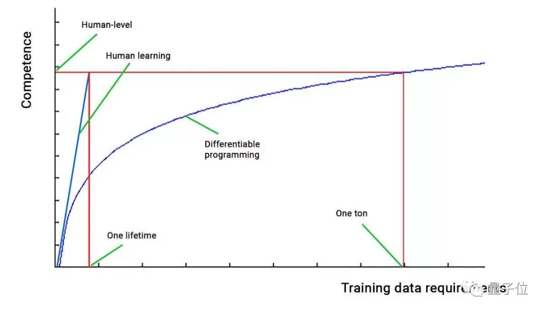 Keras的作者François Chollet认为,虽然人类训练速度比较快,但人的一生时间是有限的,只能达到某个限定的水平,但AI可以用无限长的时间训练,从而超过人类的水平: