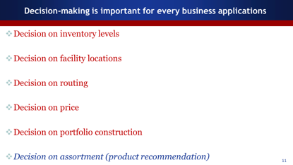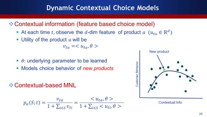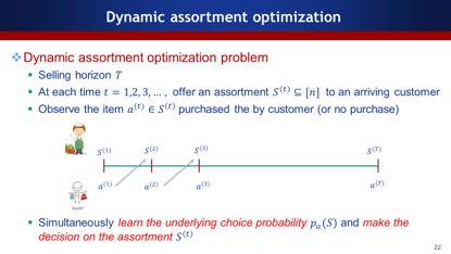 上图是简单的动态雏形,在每一个时刻我们假设给用户做一个产品的推荐,通过用户购买情况,不断的学习和做决策,一直到整个销售区间终止。如果知道用户的选择概率,可以把它做成静态的优化问题,如果不知道,就做成一个动态的优化问题。