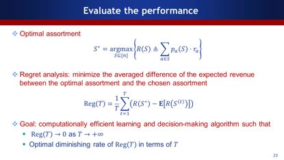 怎么评估算法的好坏?在学术圈有一个叫Regret analysis的方法:将最佳分类与选择分类预期收益均差最小化。我们的目标是构造一个机器学习和决策的算法,使得在时间足够长的时候,收益差非常小,以及收益差怎么减少。