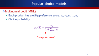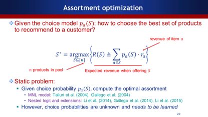 给定choice model,如何选择最好的产品推荐给客户?我们选择一个S(推荐的产品)做组合优化,使得它数学期望值的收益最大化。然而,现实生活中更复杂的问题是你并不知道用户选择产品的概率。