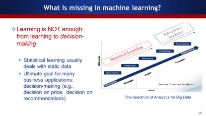 深度学习是一个自动提取特征的有效工具,比如图像的结构化让深度学习得以提取足够的特征。然而并不是每个领域的数据都能够通过深度学习的方式把有效的特征提取出来,比如在很多金融领域,一定要把深度学习与非深度学习的方法进行有效的比对。 二、从学习到决策 传统的机器学习通常处理静态数据,但是这并不能满足很多商业需求,许多商业应用最终需要做决策。